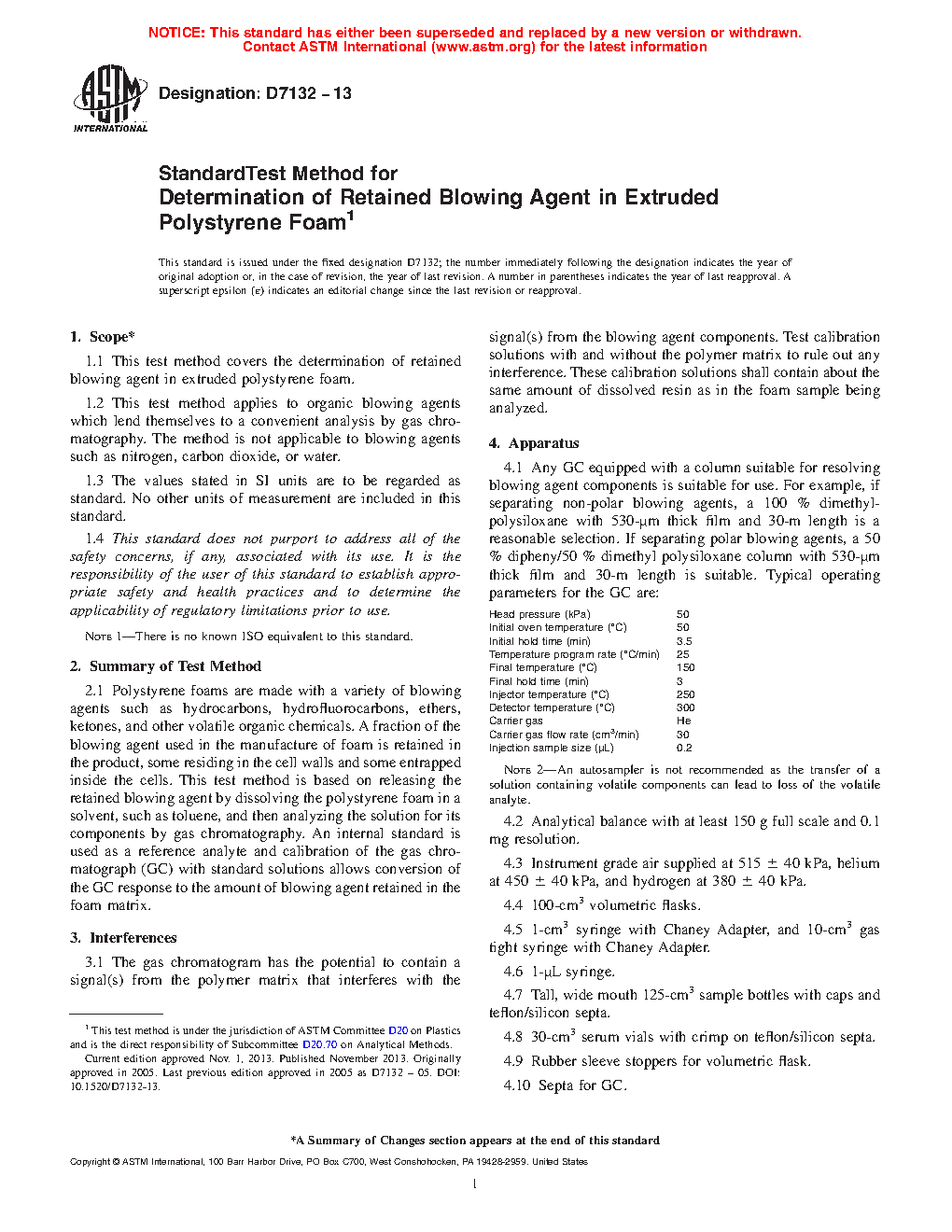 1.1 This test method covers the determination of retained blowing agent in extruded polystyrene foam.