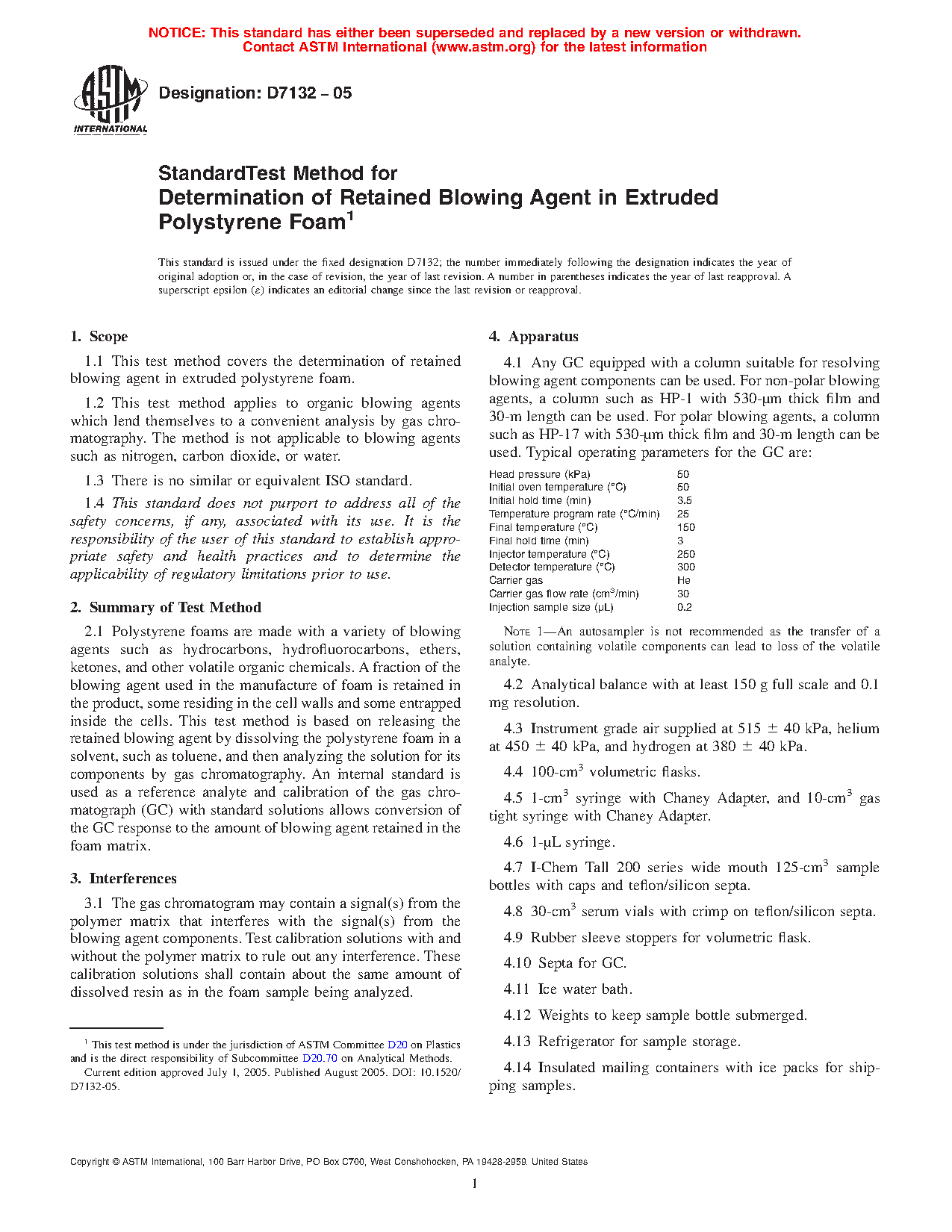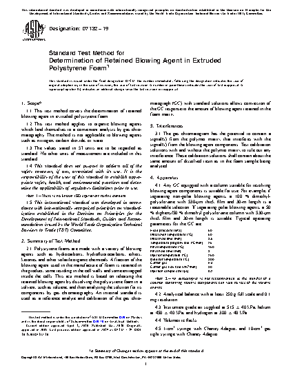This test method covers the determination of retained blowing agent in extruded polystyrene foam. The internal standard preparation procedures of the material are presented in details. The procedures for determination of retained blowing agent in extruded polyester foam are presented in details.