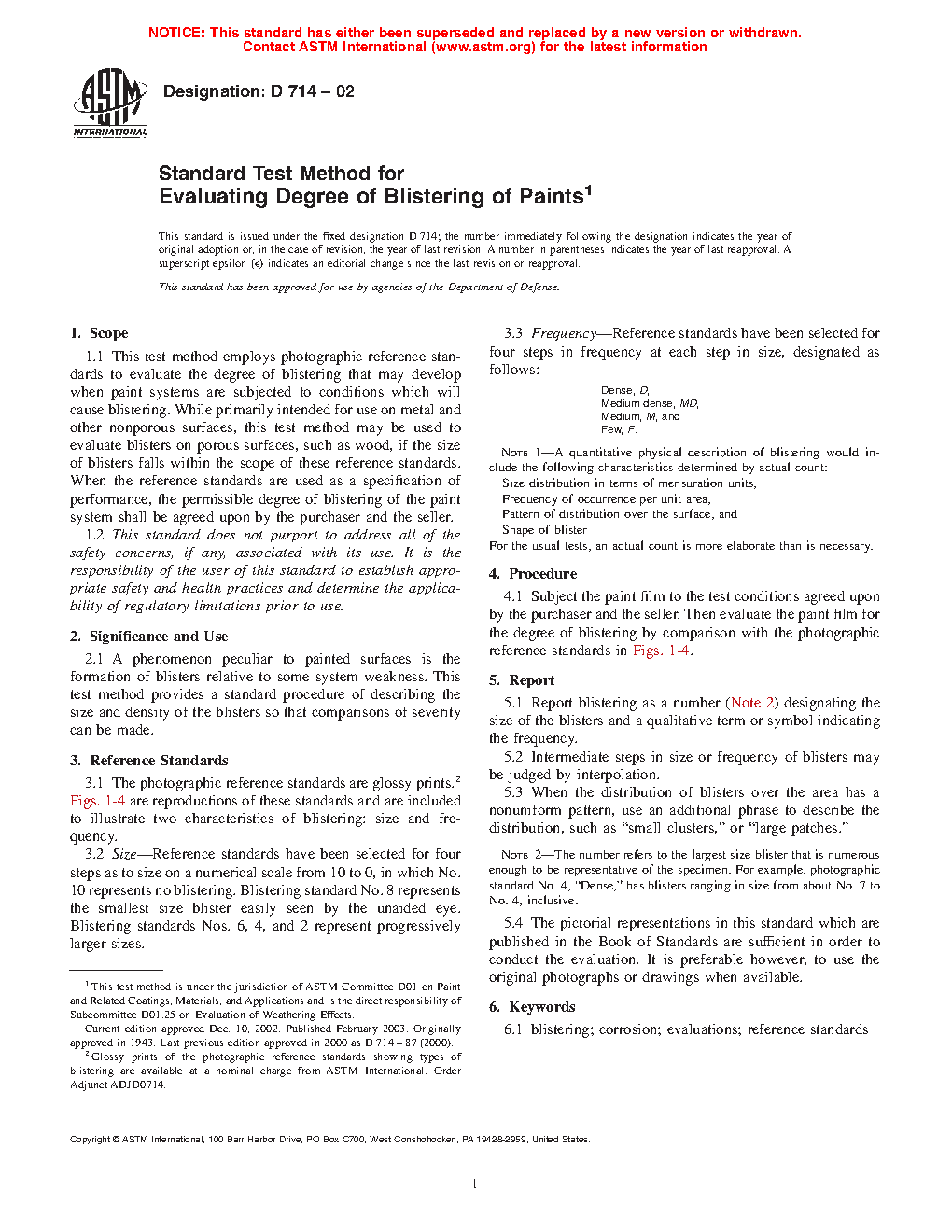1.1 This test method employs photographic reference standards to evaluate the degree of blistering that may develop when paint systems are subjected to conditions which will cause blistering. While primarily intended for use on metal and other nonporous surfaces, this test method may be used to evaluate blisters on porous surfaces, such as wood, if the size of blisters falls within the scope of these reference standards. When the reference standards are used as a specification of performance, the permissible degree of blistering of the paint system shall be agreed upon by the purchaser and the seller.