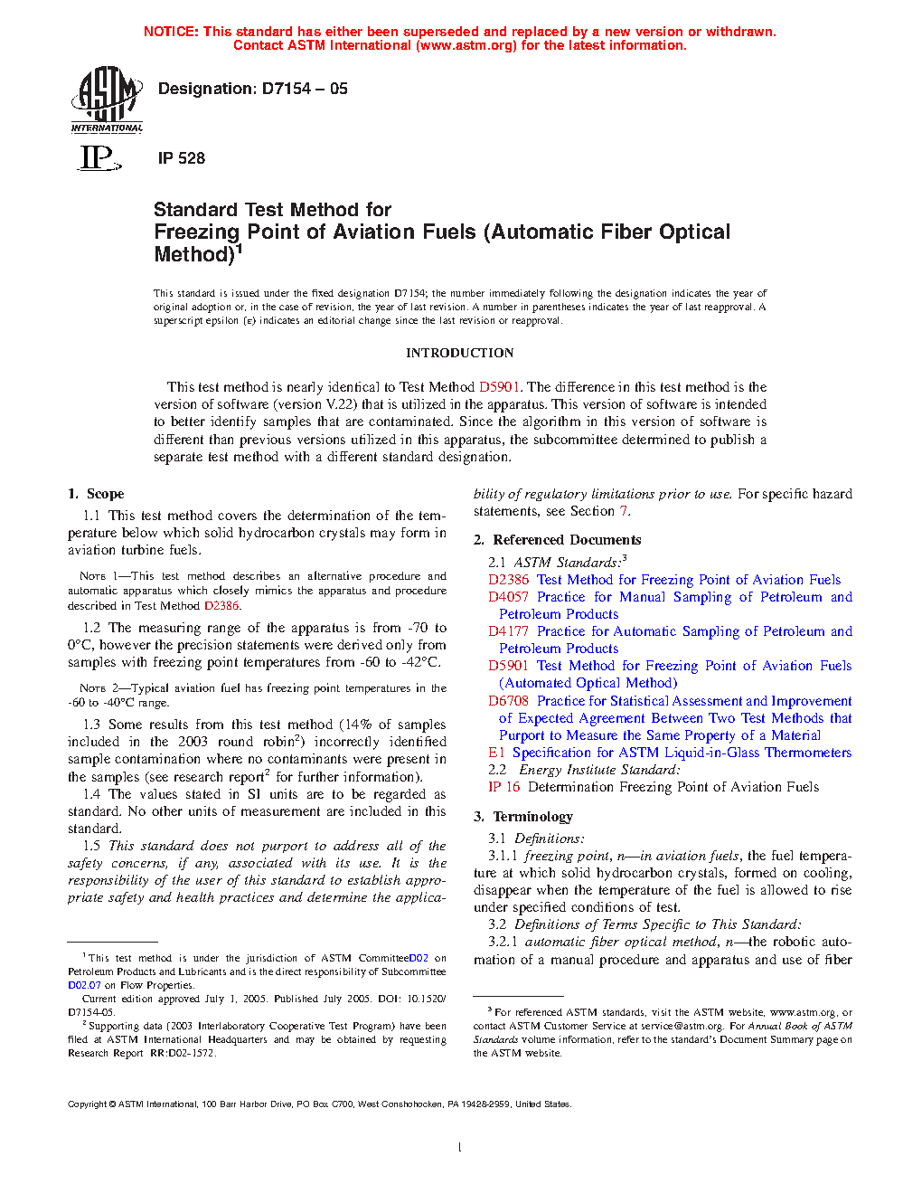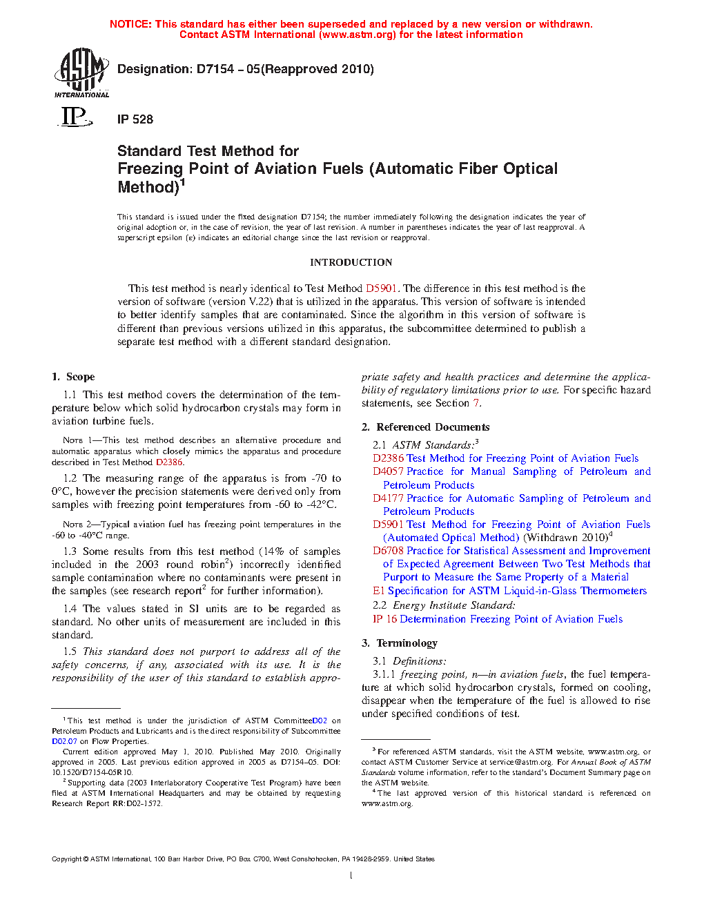 1.1 This test method covers the determination of the temperature below which solid hydrocarbon crystals may form in aviation turbine fuels.