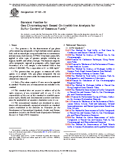 5.1 On-line, at-line, in-line, CFMS, and other near-real time monitoring systems that measure fuel gas characteristics, such as the sulfur content, are prevalent in the natural gas and fuel gas industries. The installation and operation of particular systems vary on the specific objectives, contractual obligations, process type, regulatory requirements, and internal performance requirements needed by the user. This standard is intended to provide guidelines for standardized start-up procedures, operating procedures, and quality assurance practices for on-line, at-line, in-line, CFMS, and other near-real time gas chromatographic based sulfur monitoring systems used to determine fuel gas sulfur content. For measurement of gaseous fuel properties using laboratory based methods the user is referred to Test Methods D1072, D1945, D4084, D4468, D4810 and Practices D4626, E594.
