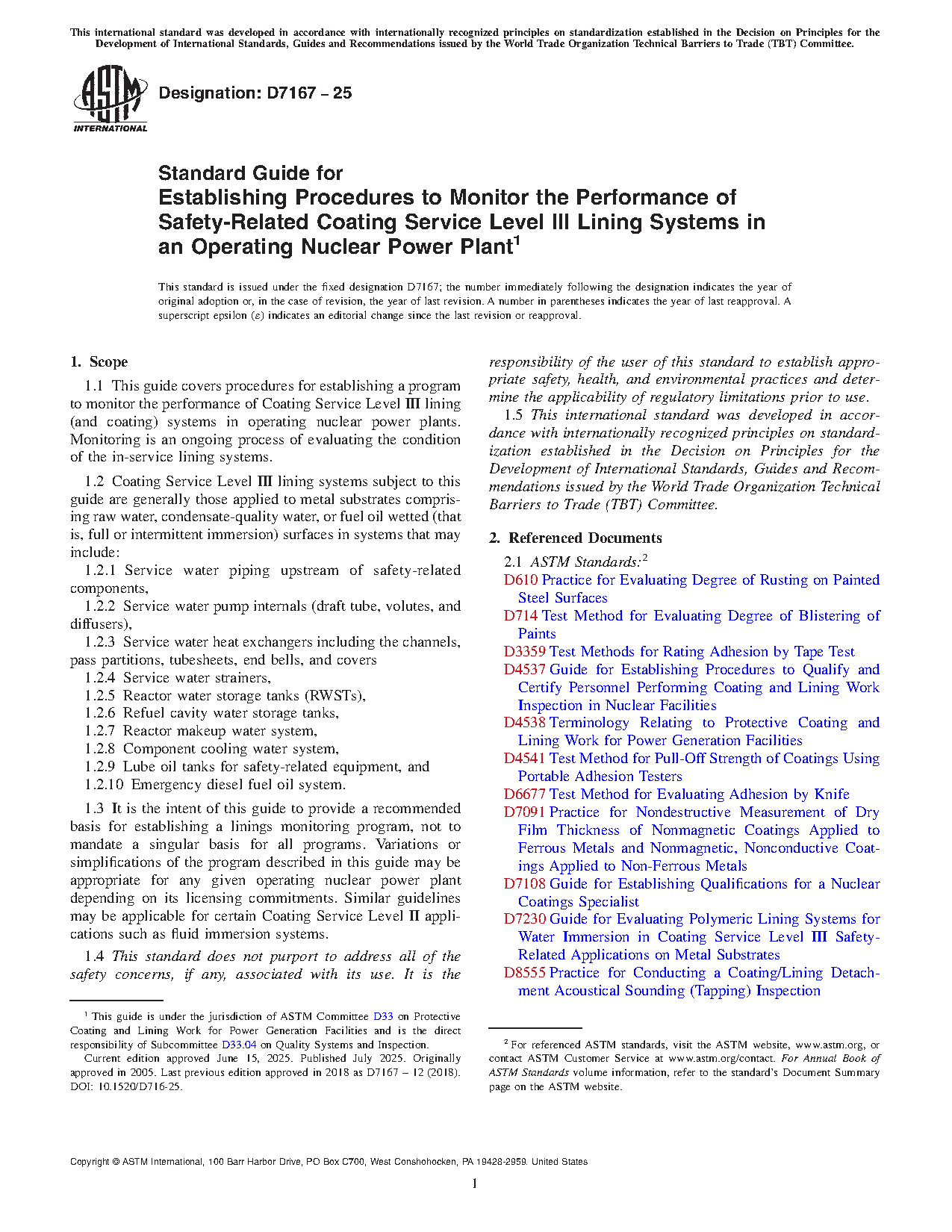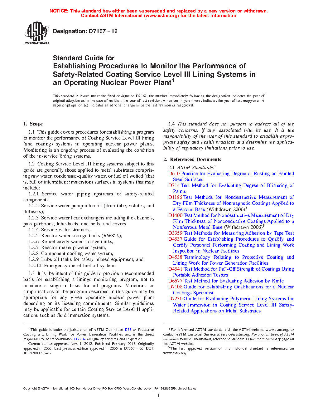 4.1 Establishment of an in-service linings monitoring program permits planning and prioritization of lining maintenance work as needed to maintain lining integrity and performance in nuclear Coating Service Level III systems. Refer to ASTM MNL-8, Manual on Maintenance Coatings for Nuclear Power Plants,7 and Guide D7230, which provides guidance for selecting lining materials for new construction or maintenance of safety-related lining systems.