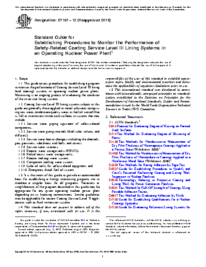 1.3 It is the intent of this guide to provide a recommended basis for establishing a linings monitoring program, not to mandate a singular basis for all programs. Variations or simplifications of the program described in this guide may be appropriate for any given operating nuclear power plant depending on its licensing commitments. Similar guidelines may be applicable for certain Coating Service Level II applications such as fluid immersion systems.