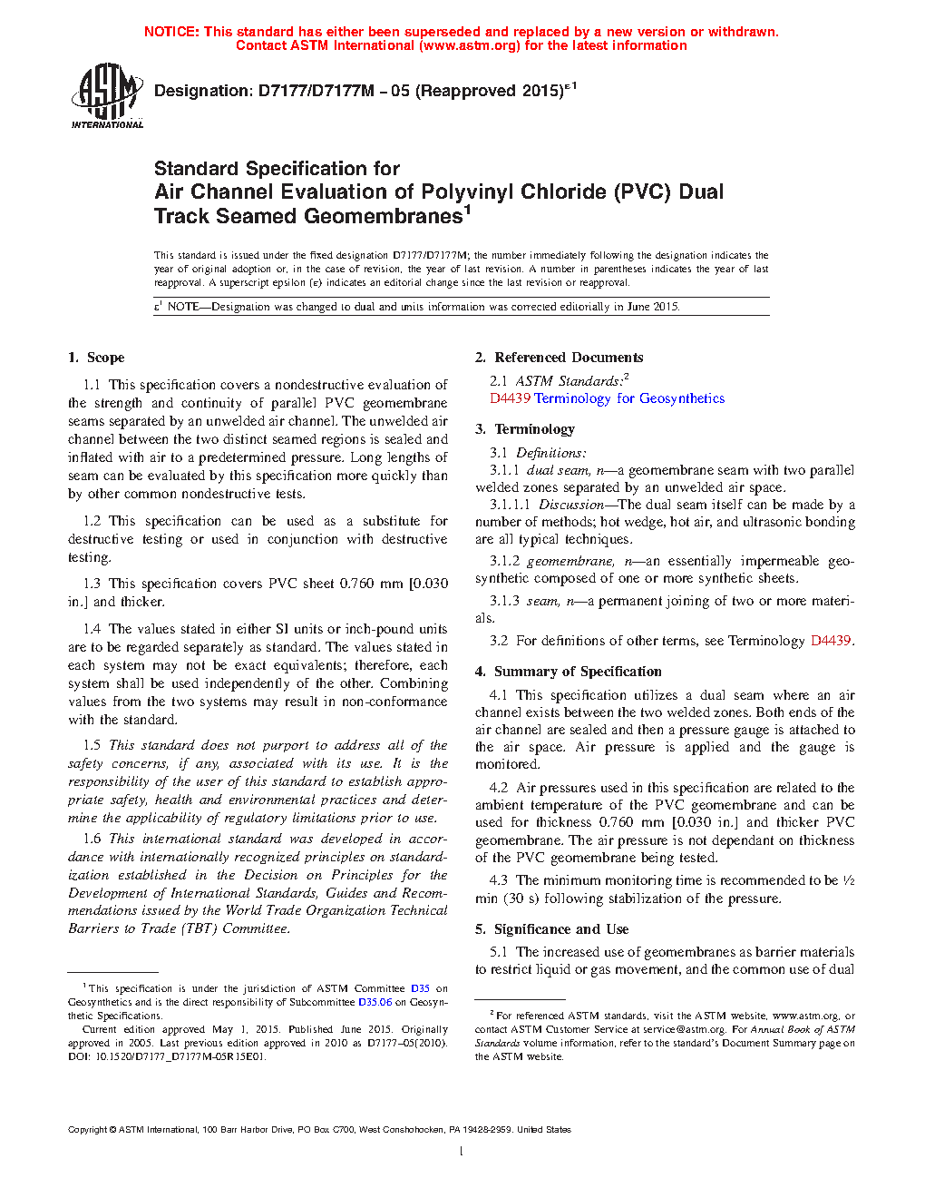 1.1 This specification covers a nondestructive evaluation of the strength and continuity of parallel PVC geomembrane seams separated by an unwelded air channel. The unwelded air channel between the two distinct seamed regions is sealed and inflated with air to a predetermined pressure. Long lengths of seam can be evaluated by this specification more quickly than by other common nondestructive tests.