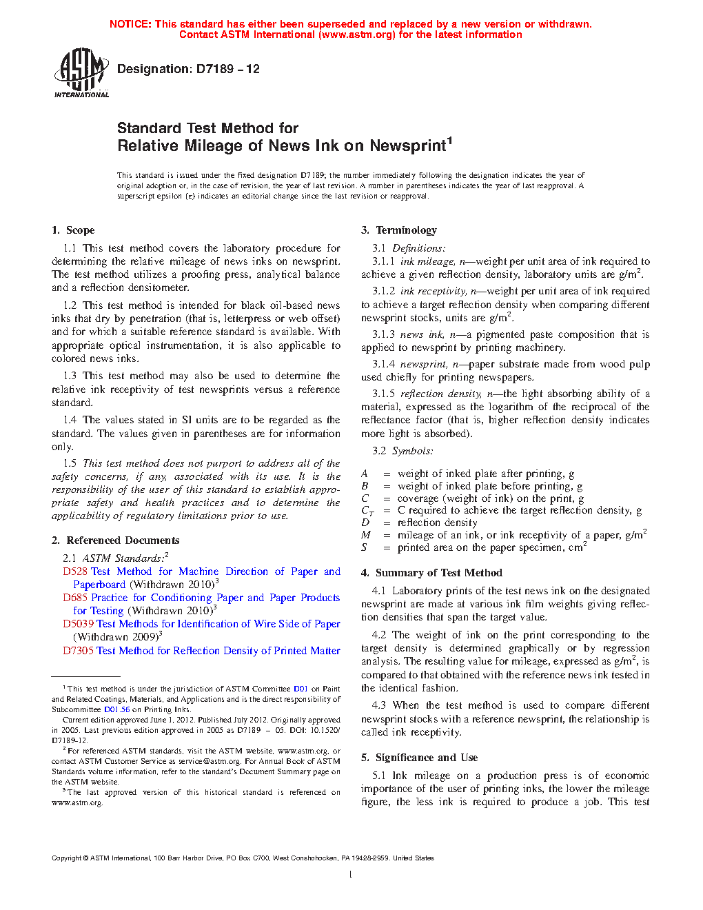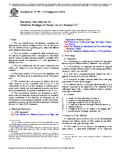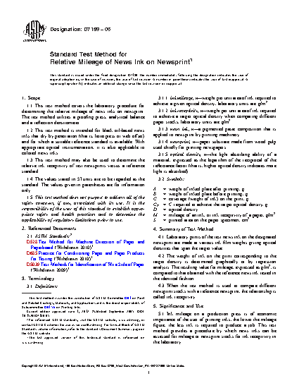 1.1 This test method covers the laboratory procedure for determining the relative mileage of news inks on newsprint. The test method utilizes a proofing press, analytical balance and a reflection densitometer.