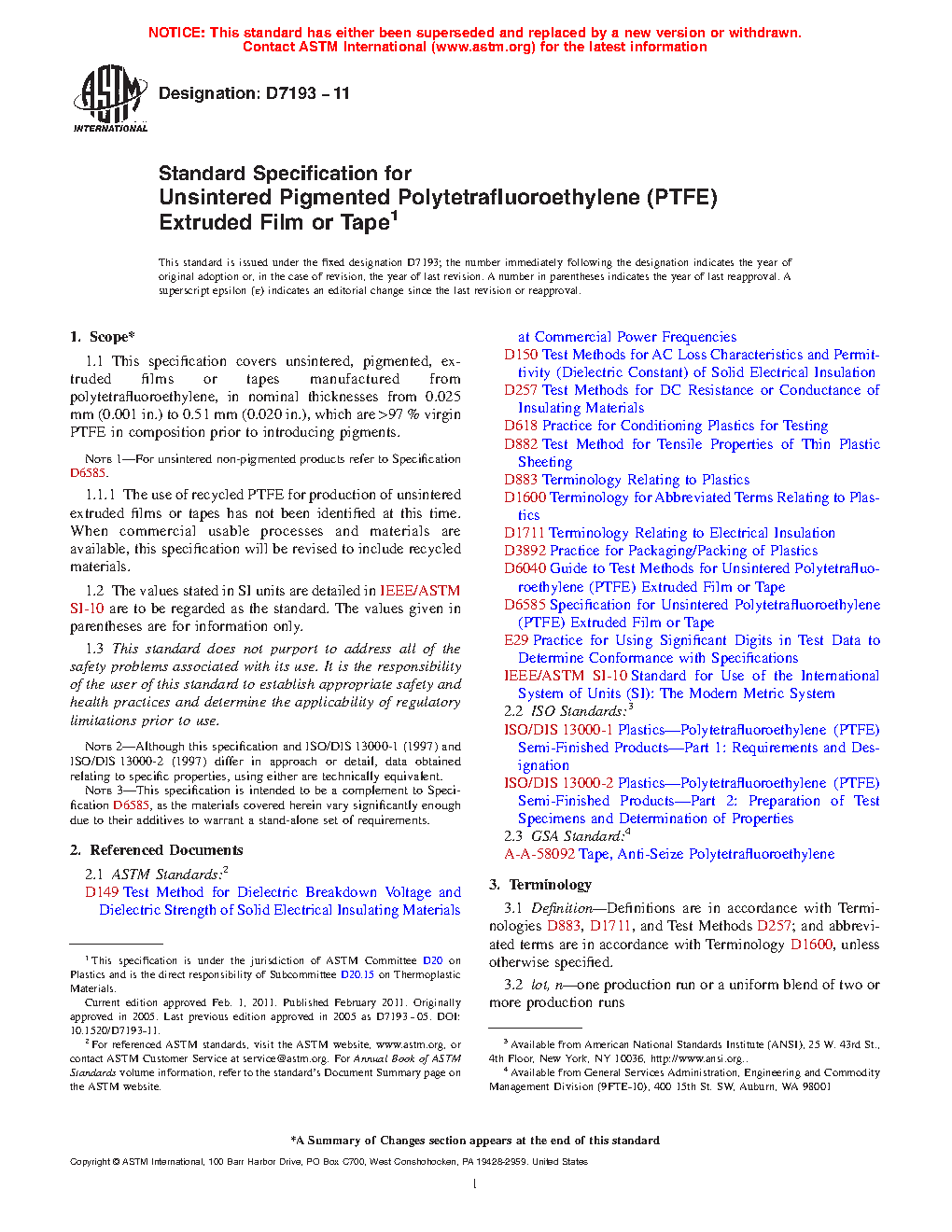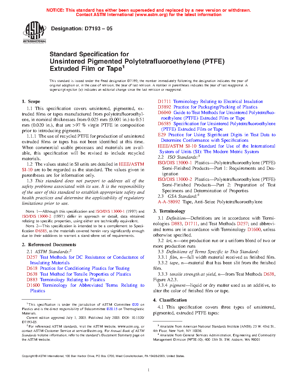 1.1.1 The use of recycled PTFE for production of unsintered extruded films or tapes has not been identified at this time. When commercial usable processes and materials are available, this specification will be revised to include recycled materials.