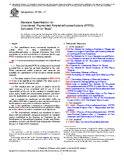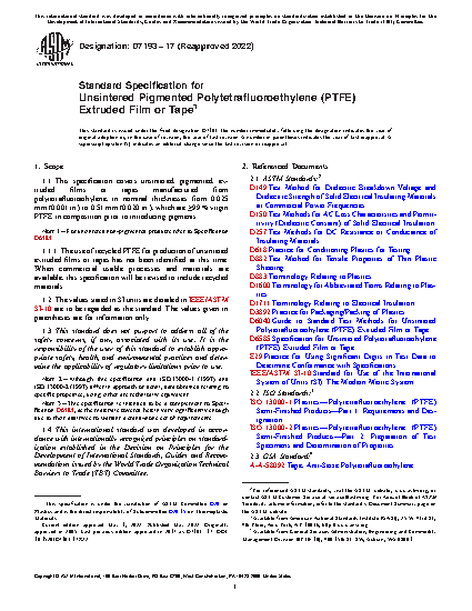 1.1 This specification covers unsintered, pigmented, extruded films or tapes manufactured from polytetrafluoroethylene, in nominal thicknesses from 0.025 mm (0.001 in.) to 0.51 mm (0.020 in.), that are >97 % virgin PTFE in composition prior to introducing pigments.