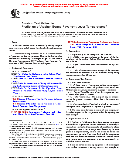 1.1 This test method covers a means of predicting temperatures within the asphalt-bound layer(s) of a flexible pavement section.