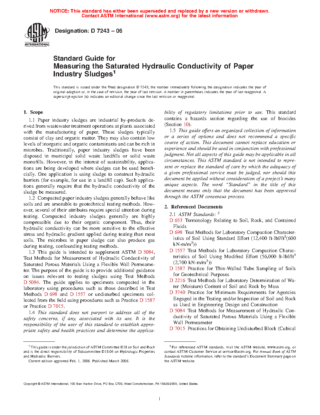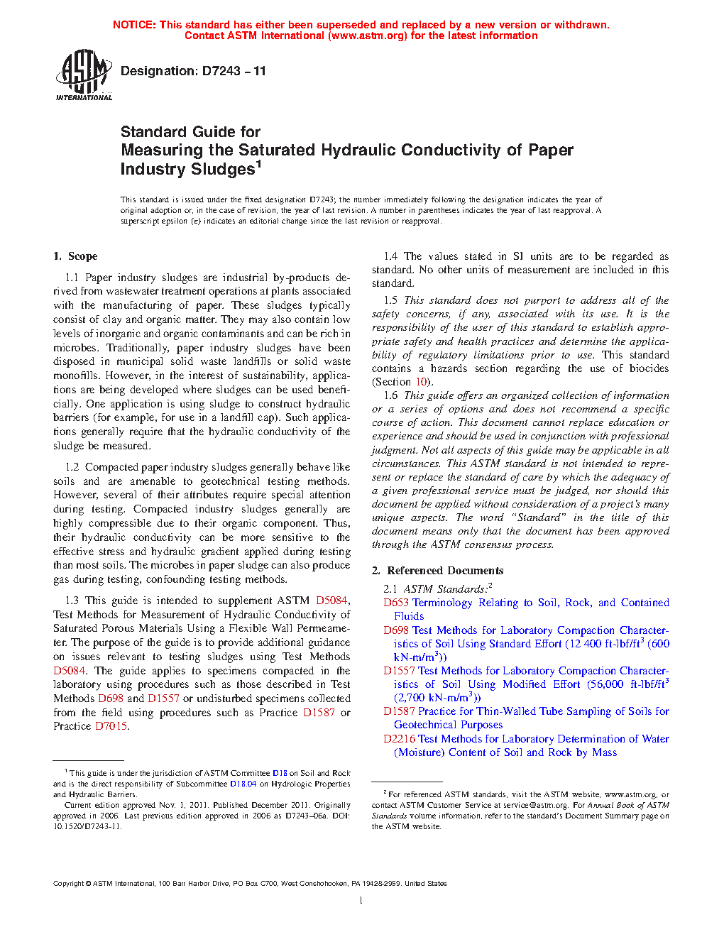 1.3 This guide is intended to supplement ASTM D 5084, Test Methods for Measurement of Hydraulic Conductivity of Saturated Porous Materials Using a Flexible Wall Permeameter. The purpose of the guide is to provide additional guidance on issues relevant to testing sludges using Test Methods D 5084. The guide applies to specimens compacted in the laboratory using procedures such as those described in Test Methods D 698 and D 1557 or undisturbed specimens collected from the field using procedures such as Practice D 1587 or Practice D 7015.