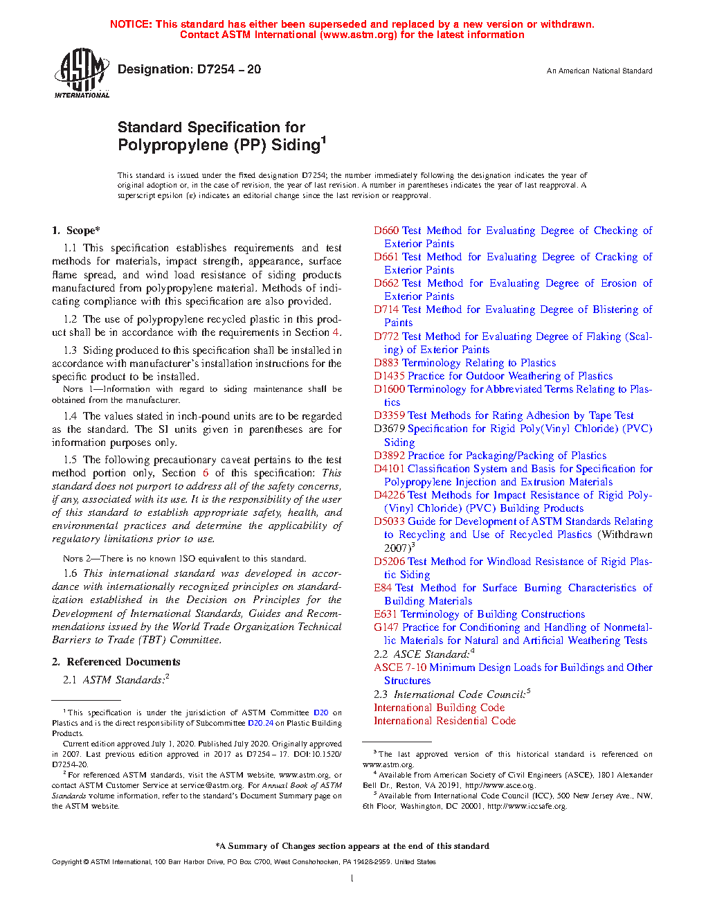 1.1 This specification establishes requirements and test methods for materials, impact strength, appearance, surface flame spread, and windload resistance of siding products manufactured from polypropylene material. Methods of indicating compliance with this specification are also provided.