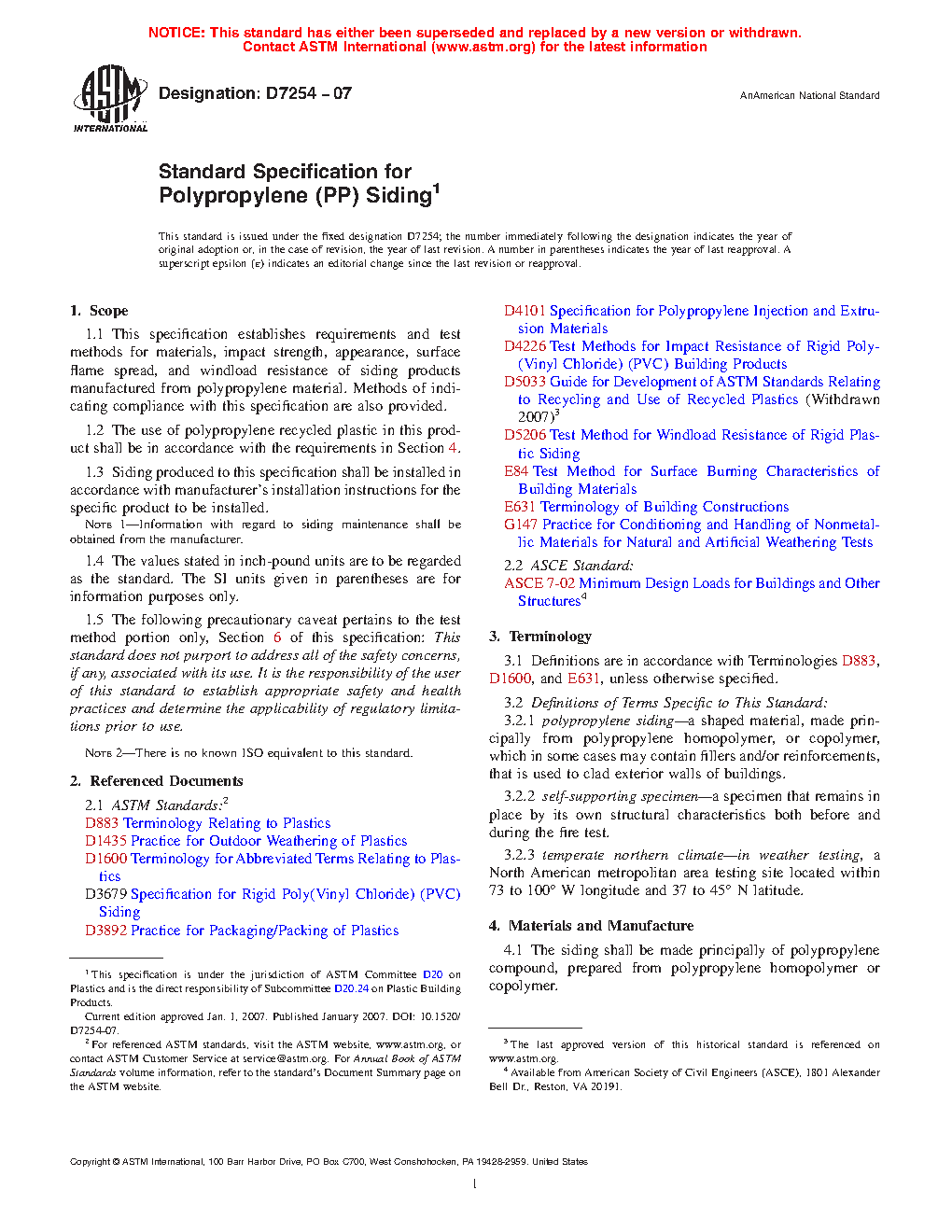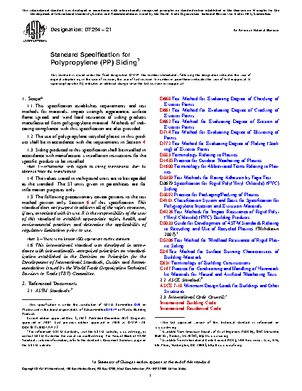 This specification establishes requirements and test methods for materials, impact strength, appearance, surface flame spread, and windload resistance of siding products manufactured from polypropylene material. The use of polypropylene recycled plastic in this product shall conform to the specified requirements. The siding shall be made principally of polypropylene compound, prepared from polypropylene homopolymer or copolymer. The polypropylene compound shall be compounded so as to provide the heat stability and weather exposure stability required for the siding market application.