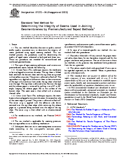 1.1 This test method describes destructive quality control and/or quality assurance tests to determine the integrity of seams produced using taped seaming methods. This test method presents the procedures used for determining the quality of taped seams subjected to both peel and shear tests. These test procedures are intended for nonreinforced and reinforced geomembranes.