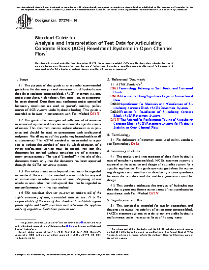 1.1 The purpose of this guide is to provide recommended guidelines for the analysis and interpretation of hydraulic test data for articulating concrete block (ACB) revetment systems under steep slope, high velocity flow conditions in a rectangular open channel. Data from tests performed under controlled laboratory conditions are used to quantify stability performance of ACB systems under hydraulic loading. This guide is intended to be used in conjunction with Test Method D7277.