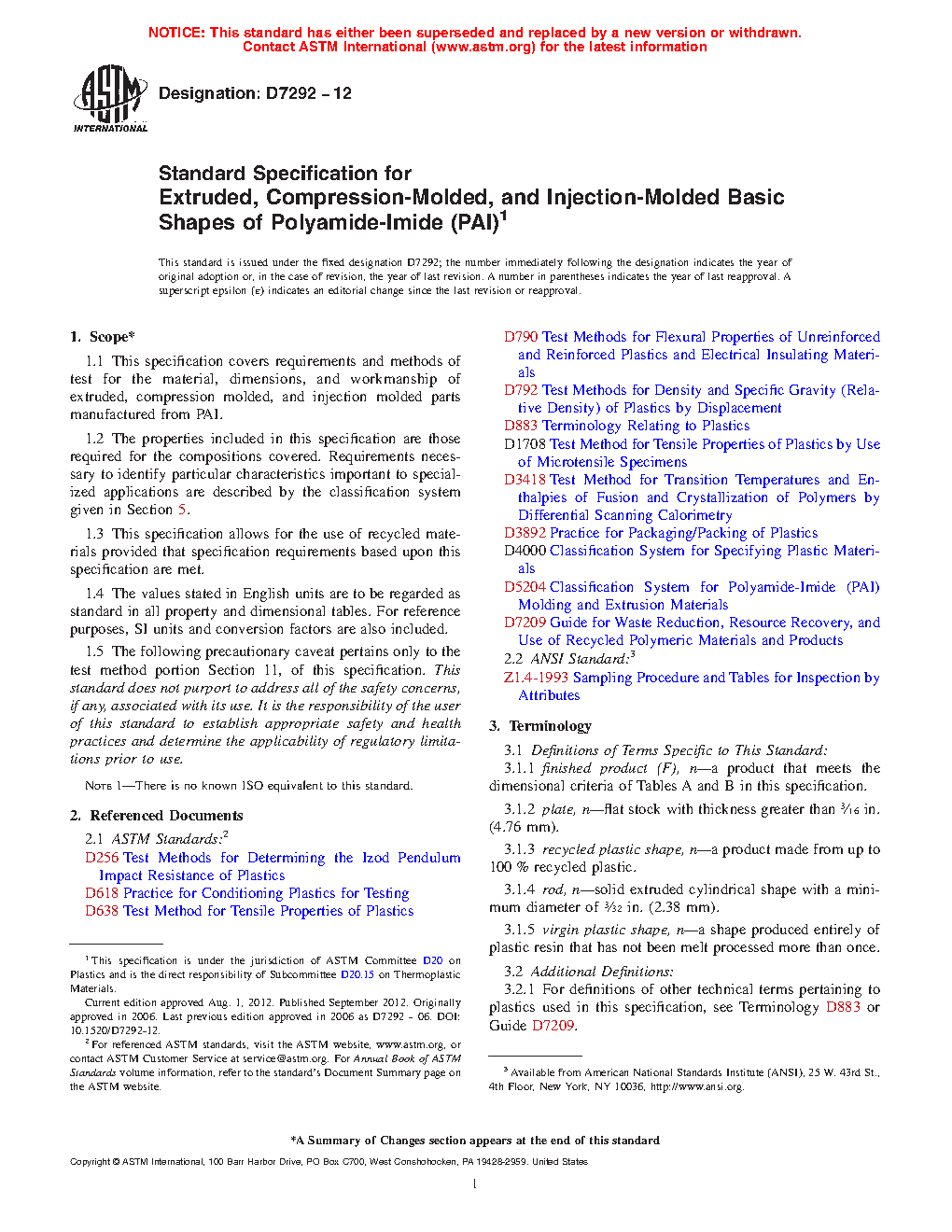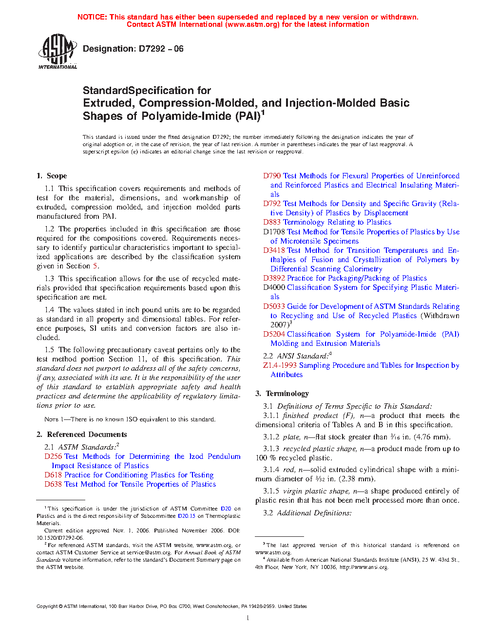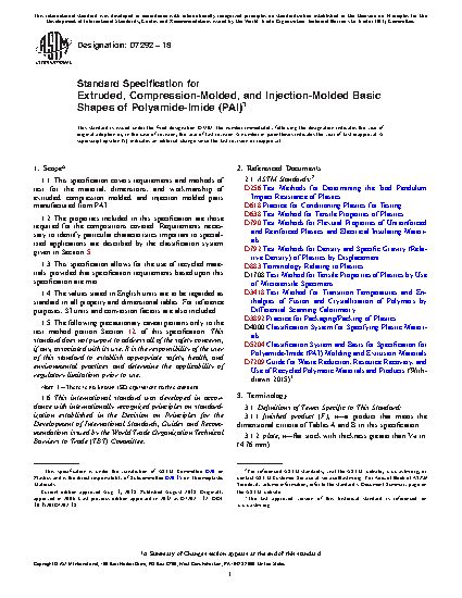 1.1 This specification covers requirements and methods of test for the material, dimensions, and workmanship of extruded, compression molded, and injection molded parts manufactured from PAI.