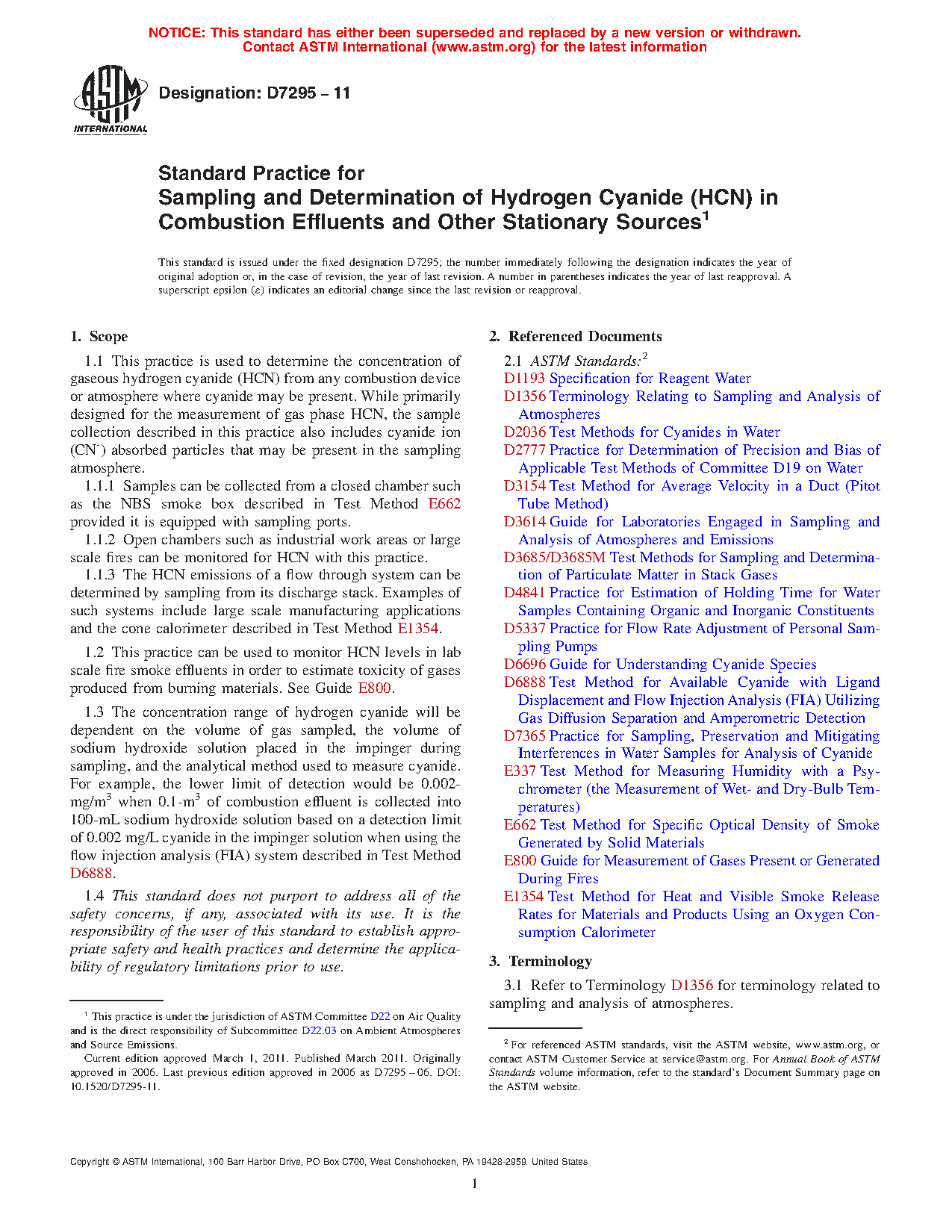 1.1 This practice is used to collect samples for the determination of gaseous hydrogen cyanide (HCN) from any combustion device or atmosphere where cyanide may be present. While primarily designed for the measurement of gas phase HCN, the sample collection described in this practice also includes cyanide ion (CN-) absorbed particles that may be present in the sampling atmosphere.