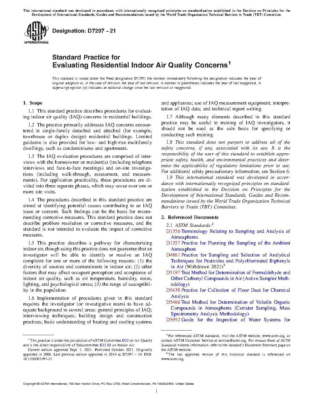 1.6 Implementation of procedures given in this standard requires the investigator (or investigative team) to have adequate background in several areas: general principles of IAQ; interviewing techniques; building design and construction practices; basic understanding of heating and cooling systems and appliances; use of IAQ measurement equipment; interpretation of IAQ data; and technical report writing.