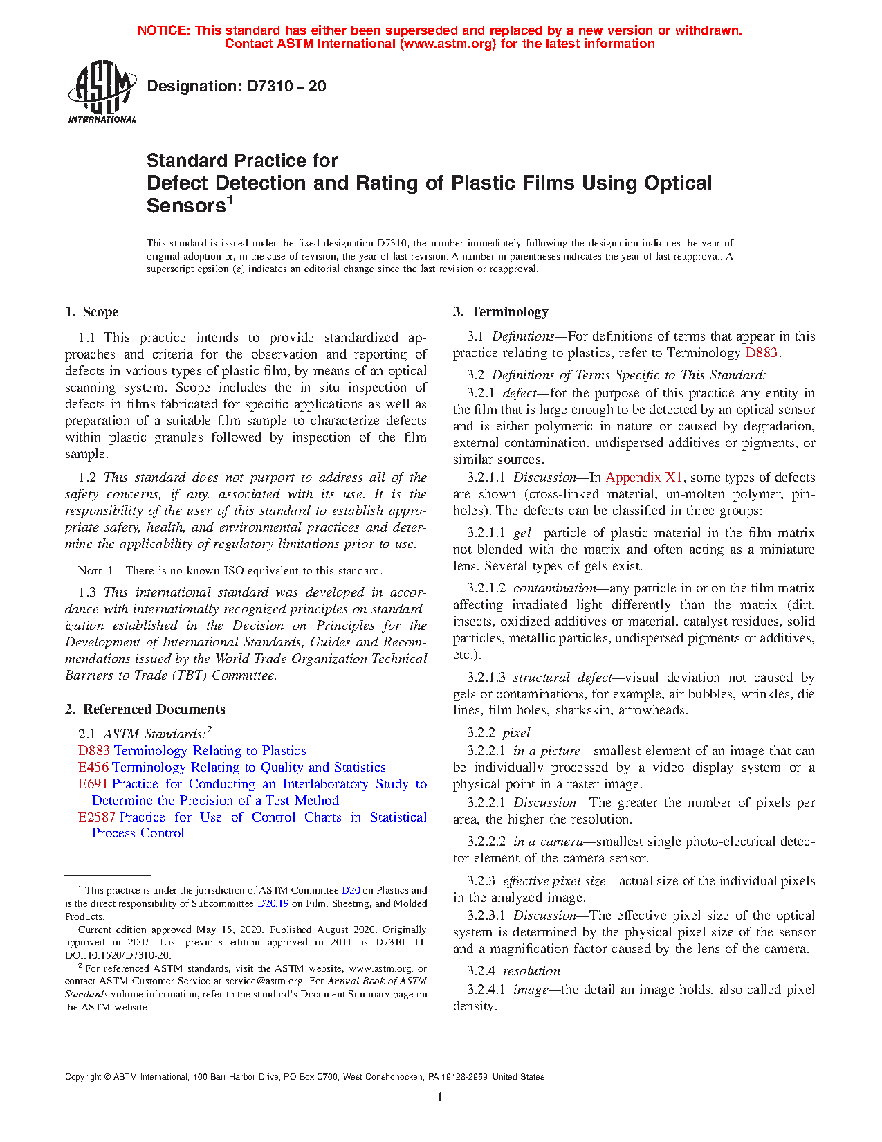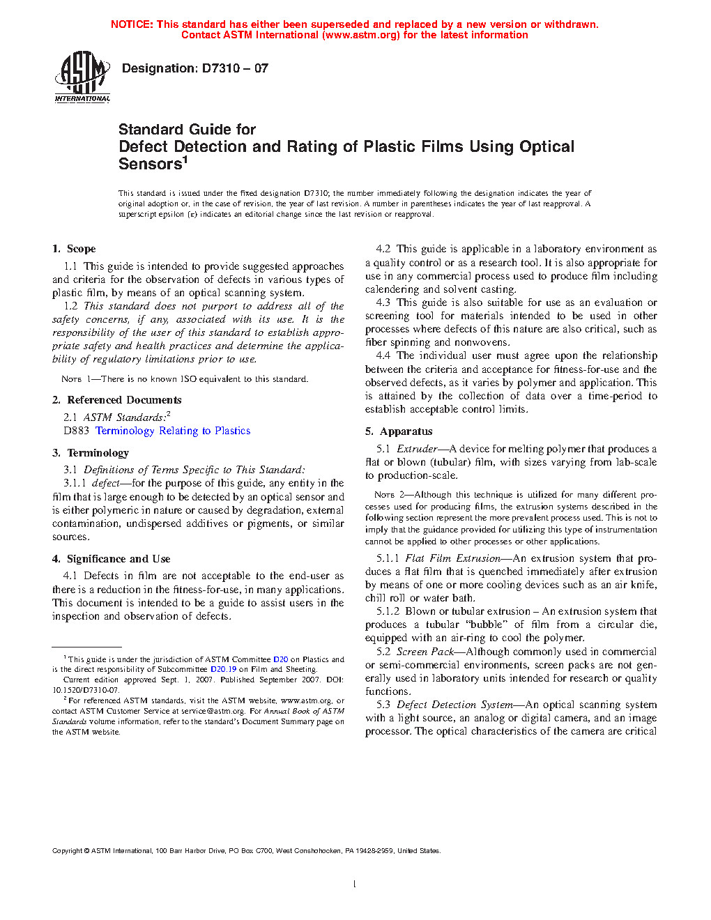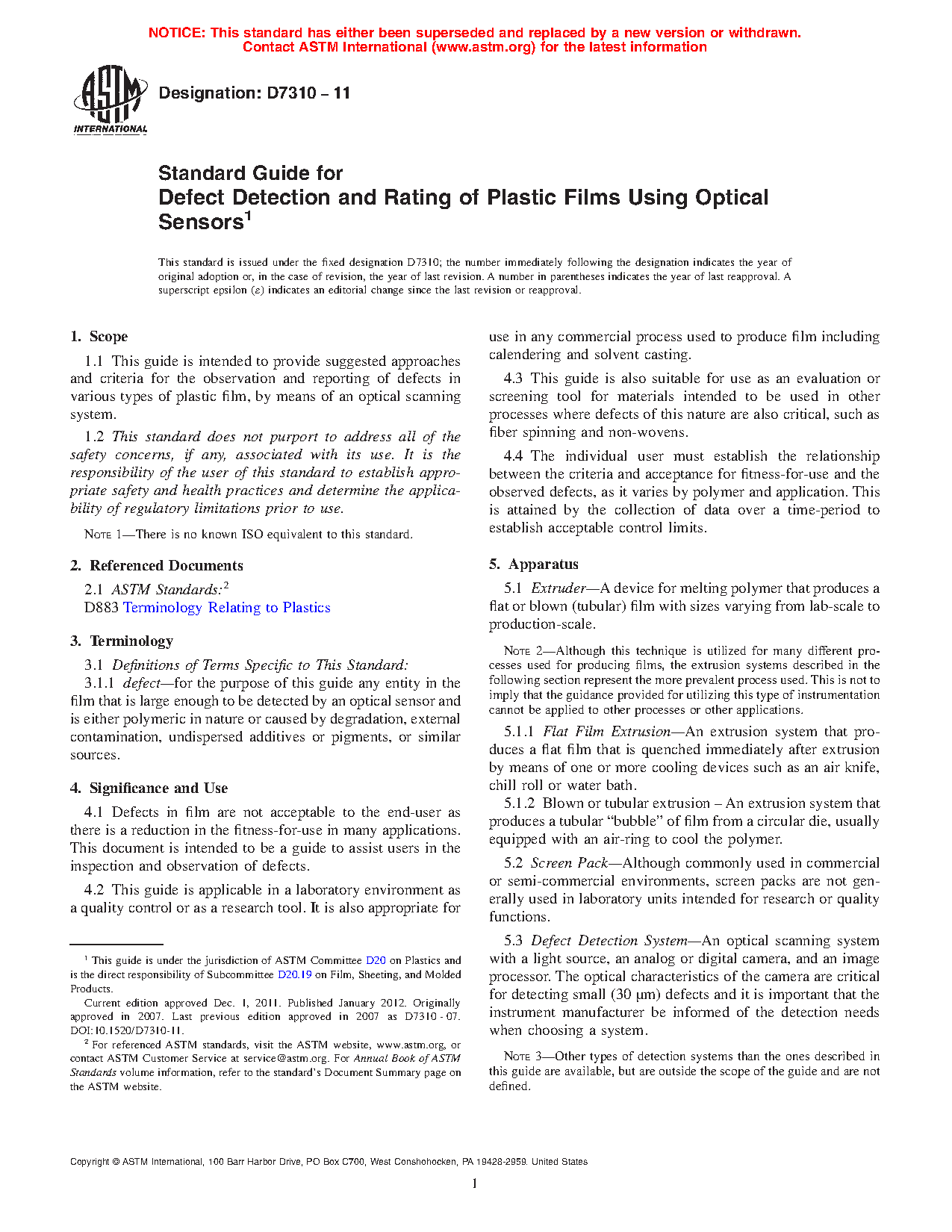 1.1 This guide is intended to provide suggested approaches and criteria for the observation of defects in various types of plastic film, by means of an optical scanning system.