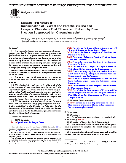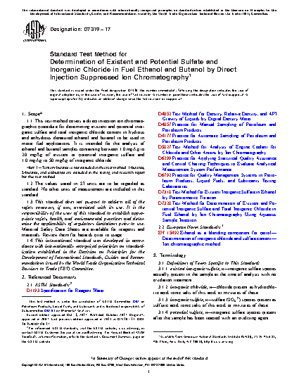 1.1 This test method covers a direct injection ion chromatographic procedure for determining existent and potential inorganic sulfate and total inorganic chloride content in hydrous and anhydrous denatured ethanol and butanol to be used in motor fuel applications. It is intended for the analysis of ethanol and butanol samples containing between 1.0 mg/kg to 20 mg/kg of existent or potential inorganic sulfate and 1.0 mg/kg to 50 mg/kg of inorganic chloride.