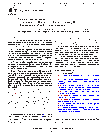 1.1 This test method establishes the guidelines, requirements and procedures for evaluating the ability of Sediment Retention Devices (SRDs) to retain sediment when exposed to sediment-laden water “sheet” flows.