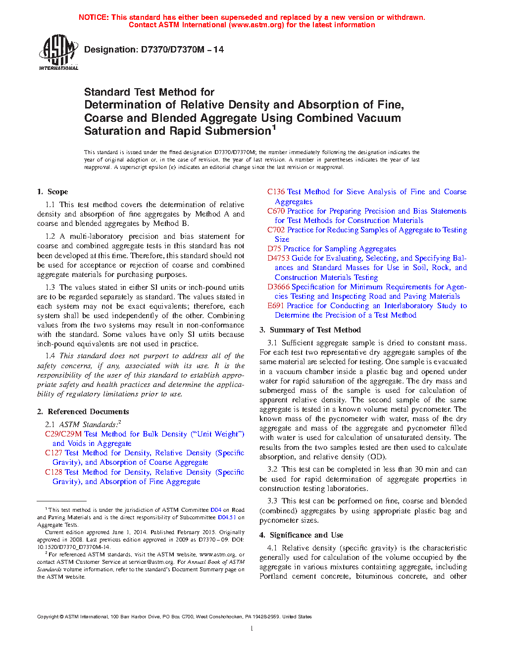 Note 1: There are other test methods that have been used and continue to be used to determine these aggregate properties: Test Methods C127 and C128. This test method may result in values for these properties that are close to or divergent from values from other test methods.