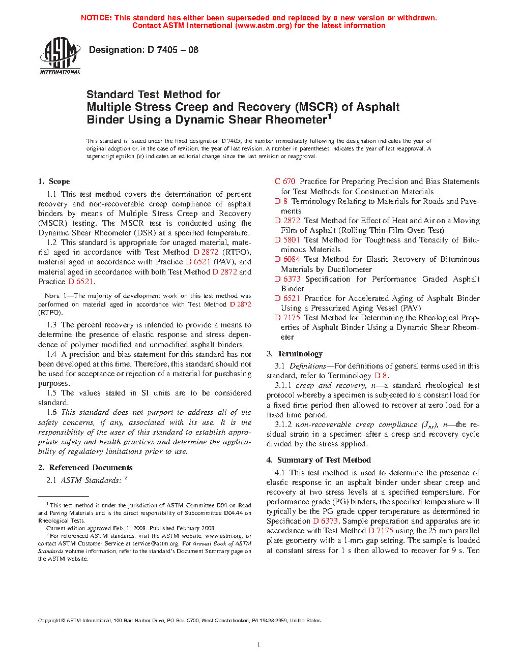 1.1 This test method covers the determination of percent recovery and non-recoverable creep compliance of asphalt binders by means of multiple stress creep and recovery (MSCR) testing. The MSCR test is conducted using the dynamic shear rheometer (DSR) at a specified temperature.