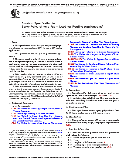 1.1 This specification covers the types and physical properties of spray polyurethane foam (SPF) for use in SPF roofing applications.