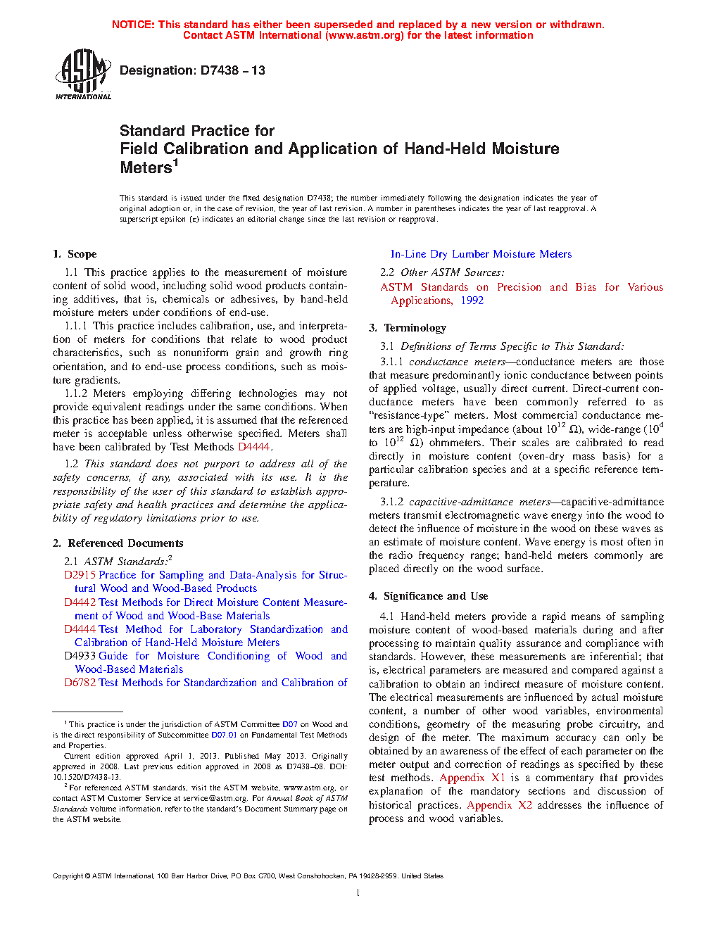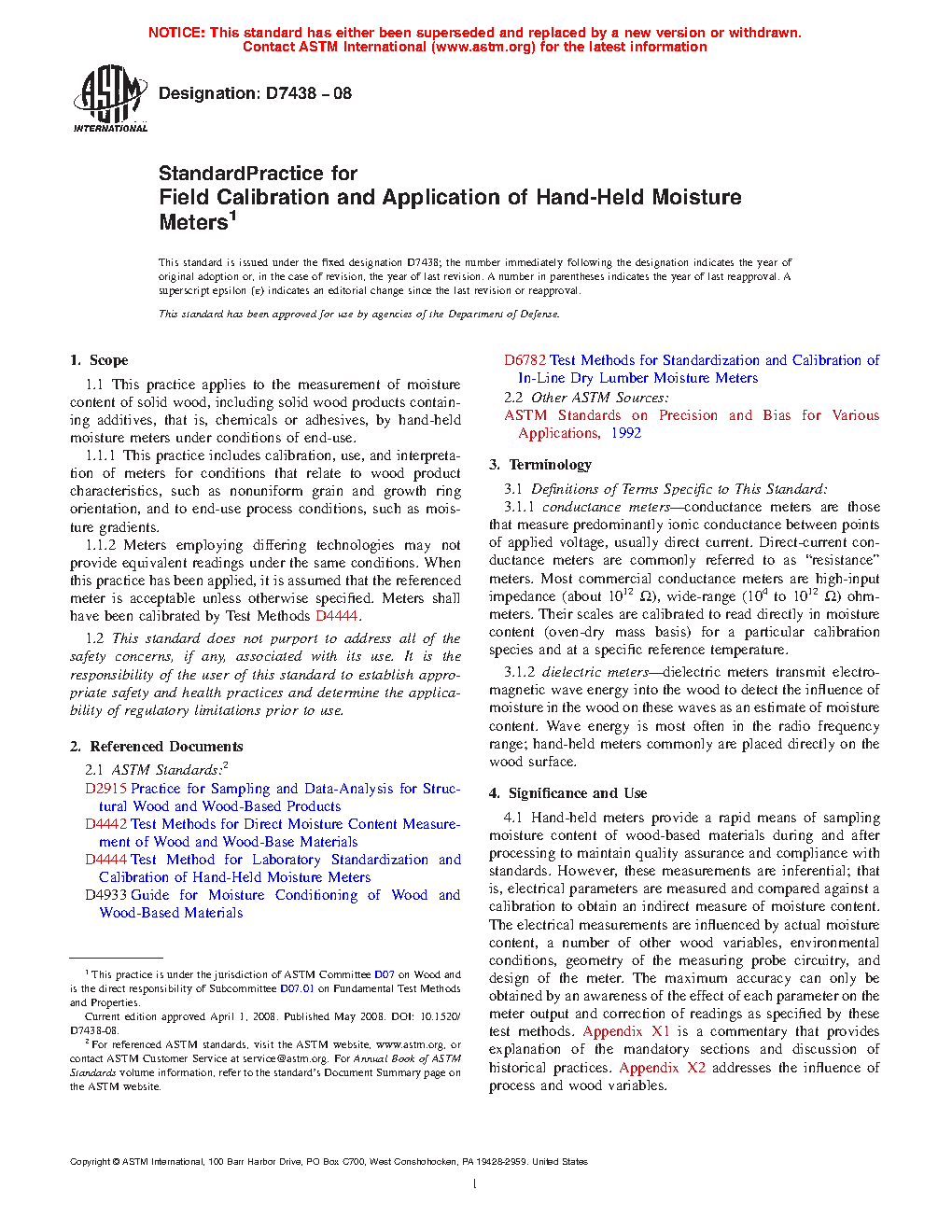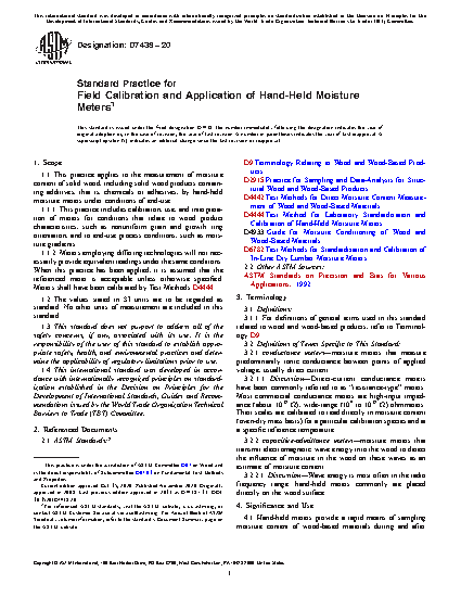 1.1 This practice applies to the measurement of moisture content of solid wood, including solid wood products containing additives, that is, chemicals or adhesives, by hand-held moisture meters under conditions of end-use.