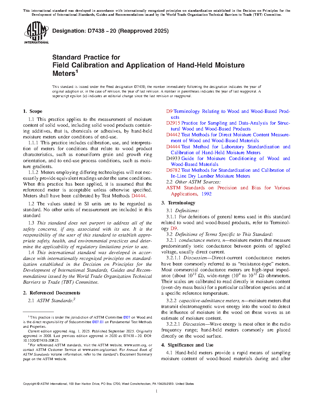 Hand-held meters provide a rapid means of sampling moisture content of wood-based materials during and after processing to maintain quality assurance and compliance with standards. However, these measurements are inferential; that is, electrical parameters are measured and compared against a calibration to obtain an indirect measure of moisture content. The electrical measurements are influenced by actual moisture content, a number of other wood variables, environmental conditions, geometry of the measuring probe circuitry, and design of the meter. The maximum accuracy can only be obtained by an awareness of the effect of each parameter on the meter output and correction of readings as specified by these test methods. Appendix X1 is a commentary that provides explanation of the mandatory sections and discussion of historical practices. Appendix X2 addresses the influence of process and wood variables.