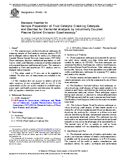 1.1 This practice covers uniform dissolution techniques for preparing samples of fluid catalytic cracking catalysts (FCC) and exchanged zeolitic materials for analysis by Inductively Coupled Plasma Atomic Emission Spectroscopy (ICP-AES). These techniques describe standardized approaches to well-known, widely used laboratory practices of sample preparation utilizing acid digestions and borate salt fusions. This practice is applicable to fresh and equilibrium FCC catalysts and exchanged zeolite materials.