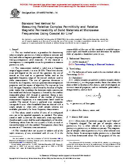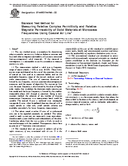 1.2 This measurement method is valid over a frequency range of approximately 1 to over 20 GHz. These limits are not exact and depend on the size of the specimen, the size of coaxial air line used as a specimen holder, and on the applicable frequency range of the network analyzer used to make measurements. The size of specimen dimension is limited by test frequency, intrinsic specimen electromagnetism properties, and the request of algorithm. For a given air line size, the upper frequency is also limited by the onset of higher order modes that invalidate the dominant-mode transmission line model and the lower frequency is limited by the smallest measurable phase shift through a specimen. Being a non-resonant method, the selection of any number of discrete measurement frequencies in a measurement band would be suitable. The coaxial fixture is preferred over rectangular waveguide fixtures when broadband data are desired with a single sample or when only small sample volumes are available, particularly for lower frequency measurements