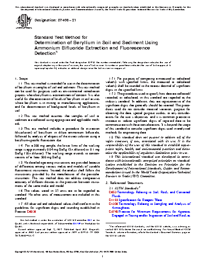 1.1 This test method is intended for use in the determination of beryllium in samples of soil and sediment. This test method can be used for purposes such as environmental remediation projects where beryllium is a contaminant of concern. It is also useful for characterization of levels of beryllium in soil at sites where beryllium is in mining or manufacturing applications, and for determination of background levels of beryllium in soil.