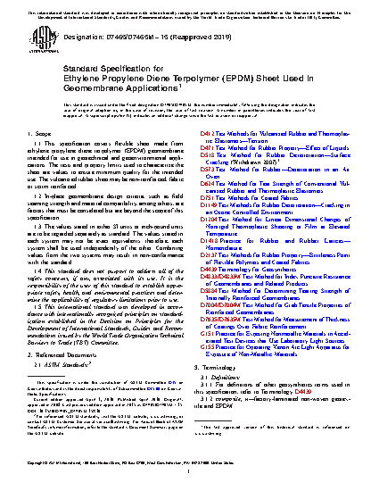 1.1 This specification covers flexible sheet made from ethylene propylene diene terpolymer (EPDM) geomembrane intended for use in geotechnical and geoenvironmental applications. The tests and property limits used to characterize the sheet are values to ensure minimum quality for the intended use. The vulcanized rubber sheet may be non-reinforced, fabric or scrim reinforced.