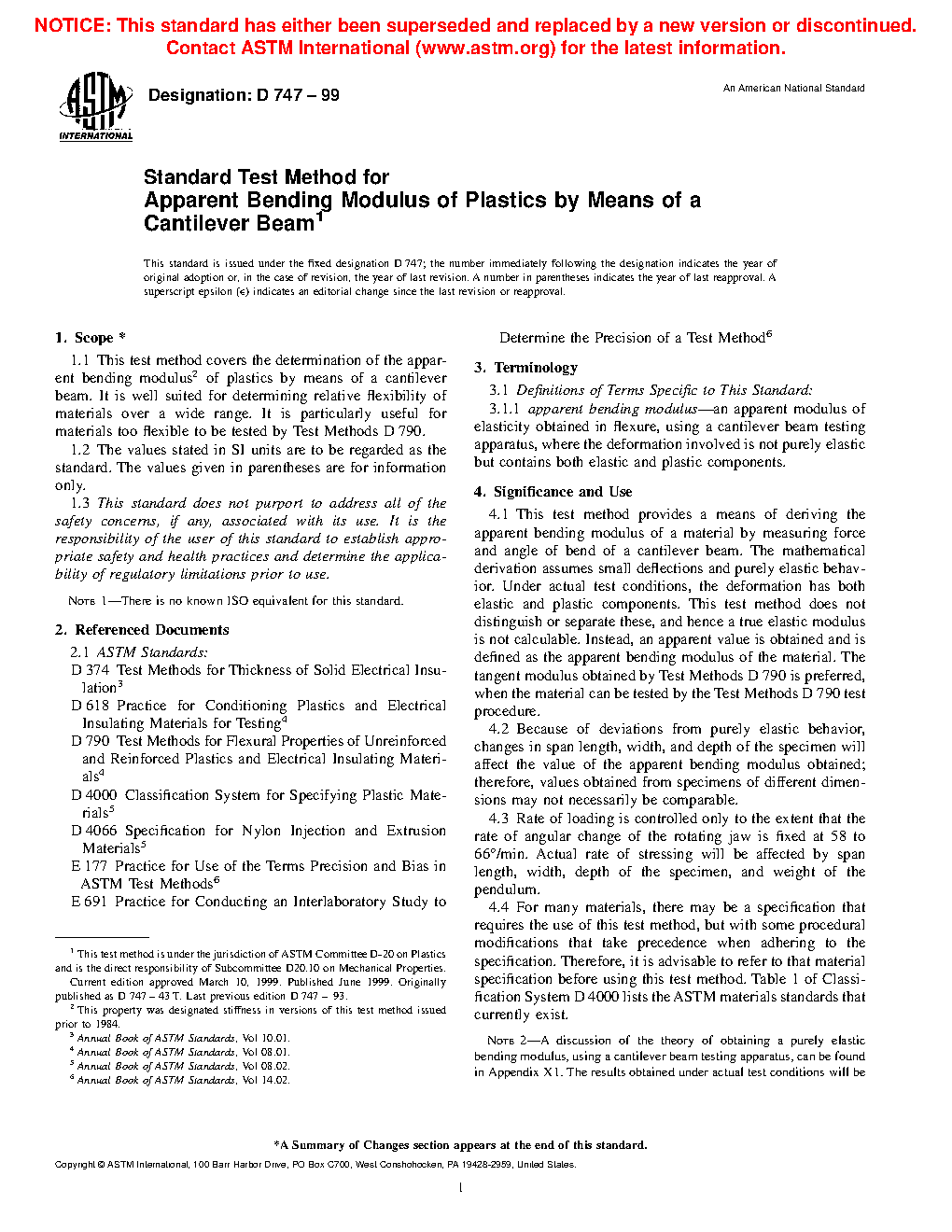 1.1 This test method covers the determination of the apparent bending modulus of plastics by means of a cantilever beam. It is well suited for determining relative flexibility of materials over a wide range. It is particularly useful for materials too flexible to be tested by Test Methods D 790.