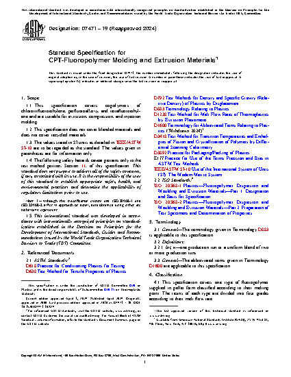 This specification addresses the physical properties of copolymers of chlorotrifluoroethylene, perfluoroalkoxy, and tetrafluoroethylene that are suitable for extrusion, compression, and injection molding. It does not cover blended and recycled materials. Covered here is one type of fluoropolymer that is supplied in pellet form and classified according to their melting points, while the resins of each type are divided into four grades according to their melt flow rates. The materials shall be sampled in accordance with an adequate statistical sampling procedure and shall conform to specific gravity, melting point, flow rate, elongation, and tensile strength requirements when tested by the procedures itemized herein.