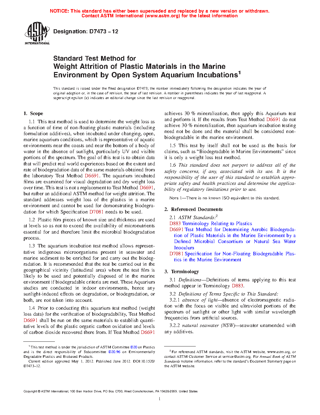 1.1 This test method is used to determine the weight loss as a function of time of non-floating plastic materials (including formulation additives), when incubated under changing, open, marine aquarium conditions, which is representative of aquatic environments near the coasts and near the bottom of a body of water in the absence of sunlight, particularly UV and visible portions of the spectrum. The goal of this test is to obtain data that will predict real world experiences based on the extent and rate of biodegradation data of the same materials obtained from the laboratory Test Method D6691. The aquarium incubated films are examined for visual degradation and dry weight loss over time. This test is not a replacement to Test Method D6691, but rather an additional ASTM method for weight attrition. The standard addresses weight loss of the plastics in a marine environment and cannot be used for demonstrating biodegradation for which Specification D7081 needs to be used.