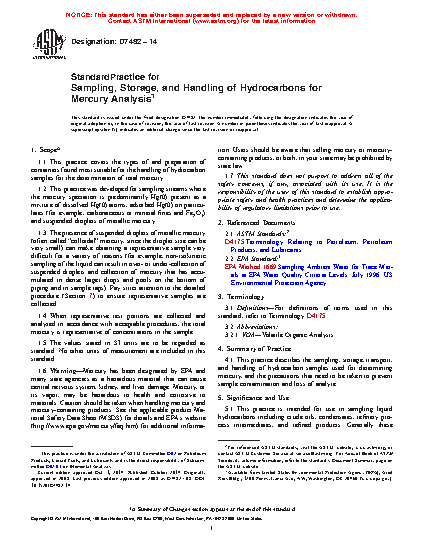 1.1 This practice covers the types of and preparation of containers found most suitable for the handling of hydrocarbon samples for the determination of total mercury.