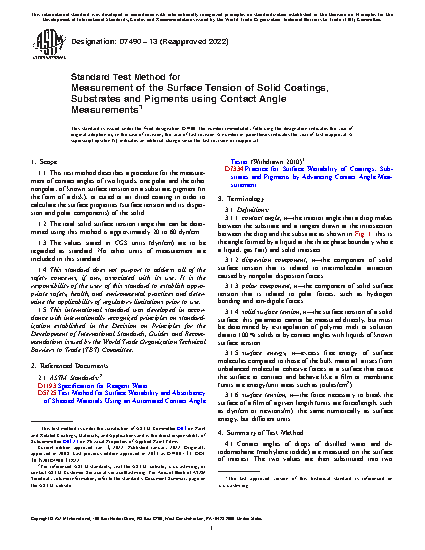 1.1 This test method describes a procedure for the measurement of contact angles of two liquids, one polar and the other nonpolar, of known surface tension on a substrate, pigment (in the form of a disk), or cured or air dried coating in order to calculate the surface properties (surface tension and its dispersion and polar components) of the solid.