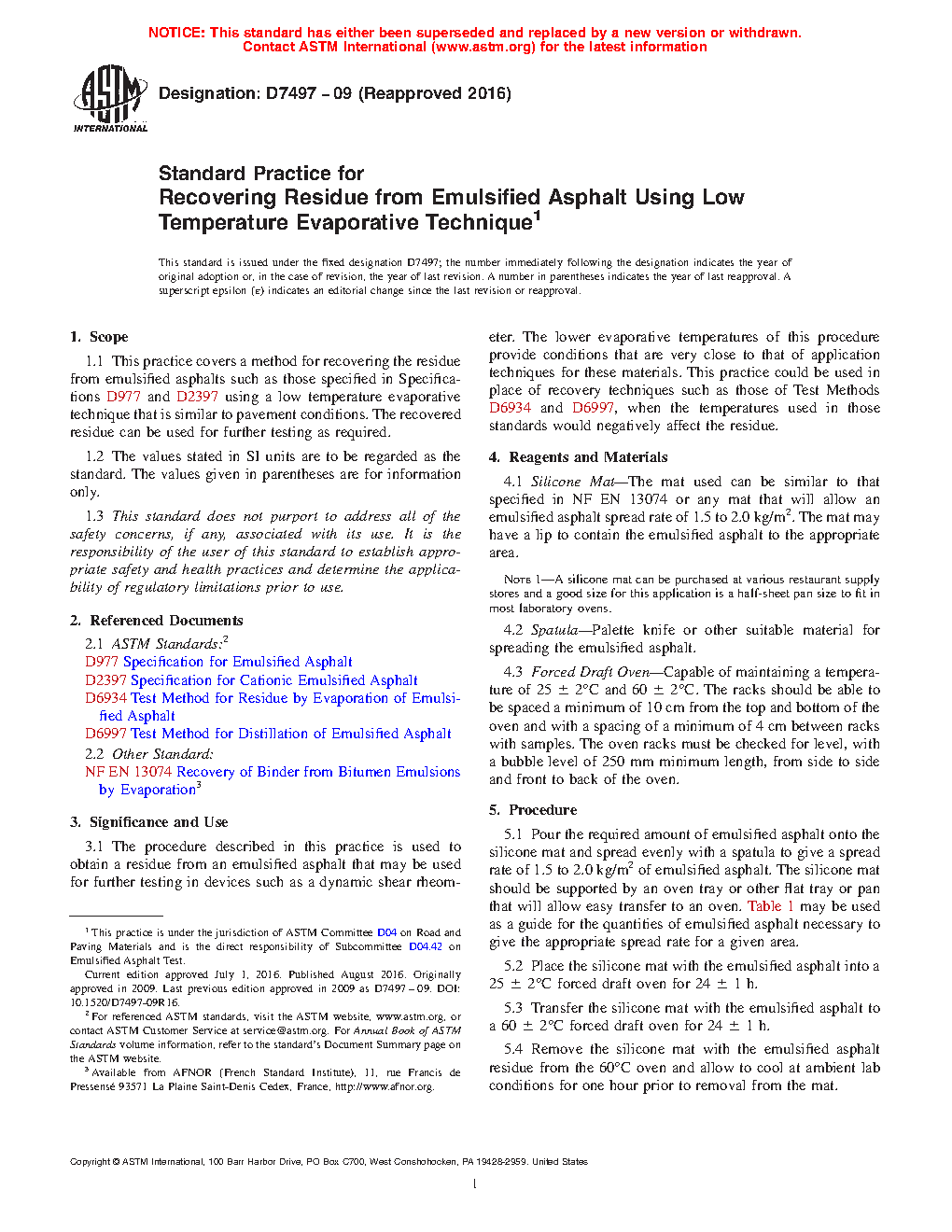 3.1 The procedure described in this practice is used to obtain a residue from an emulsified asphalt that may be used for further testing in devices such as a dynamic shear rheometer. The lower evaporative temperatures of this procedure provide conditions that are very close to those of application techniques for these materials. This practice could be used in place of recovery techniques such as those of Test Methods D6934 and D6997, when the temperatures used in those standards would negatively affect the residue.