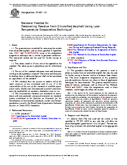 1.1 This practice covers a method for recovering the residue from emulsified asphalts such as those specified in Specifications D977 and D2397/D2397M using a low-temperature evaporative technique that is similar to pavement conditions. The recovered residue can be used for further testing as required.