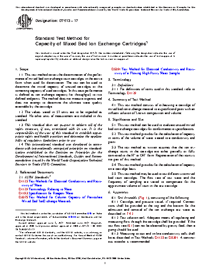 1.1 This test method covers the determination of the performance of mixed bed ion exchange resin cartridges in the active form when used for deionization. The test can be used to determine the initial capacity of unused cartridges or the remaining capacity of used cartridges. In this case performance is defined as ion exchange capacity (or throughput) to two defined endpoints. The method does not measure organics and does not attempt to determine the ultimate water quality attainable by the cartridge.