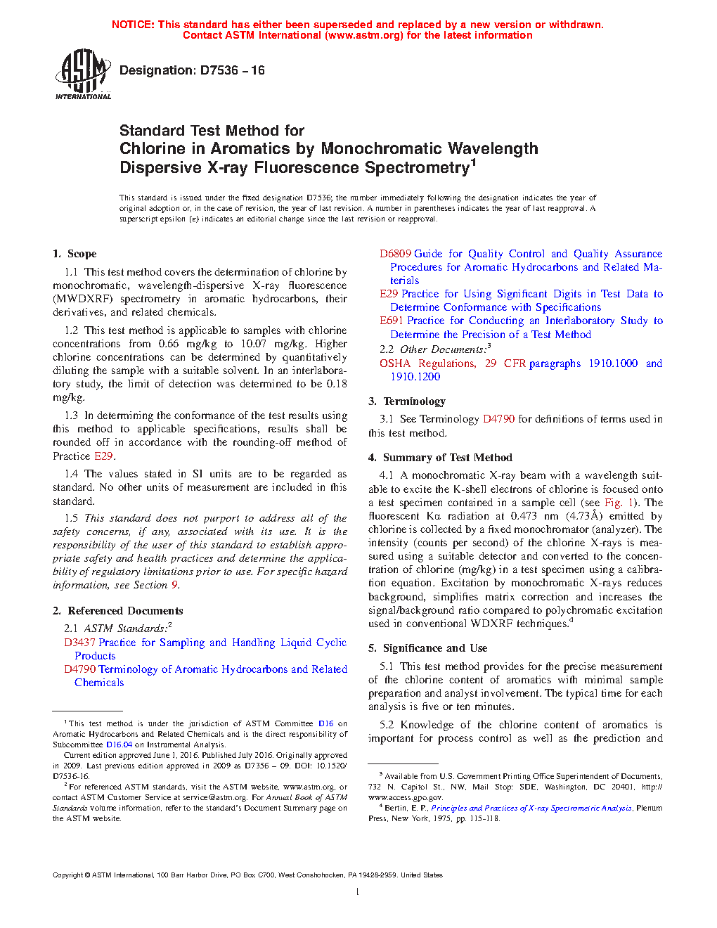 1.1 This test method covers the determination of chlorine by monochromatic wavelength-dispersive X-ray fluorescence (MWDXRF) spectrometry in aromatic hydrocarbons, their derivatives, and related chemicals.