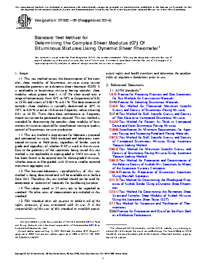 1.1 This test method covers the determination of the complex shear modulus of bituminous mixtures using torsion rectangular geometry on a dynamic shear rheometer (DSR). It is applicable to bituminous mixtures having complex shear modulus values greater than 1 × 104 Pa when tested over a range of temperatures from 10°C to 76°C at frequencies of 0.01 to 25 Hz and strains of 0.001 % to 0.1 %. The determination of complex shear modulus is typically determined at 20°C to 70°C at 0.01% strain at 10 discrete frequency values covering 0.01 to 10 Hz. From these data, temperature or frequency master curves can be generated as required. This test method is intended for determining the complex shear modulus of bituminous mixtures as required for specification testing or quality control of bituminous mixture production.