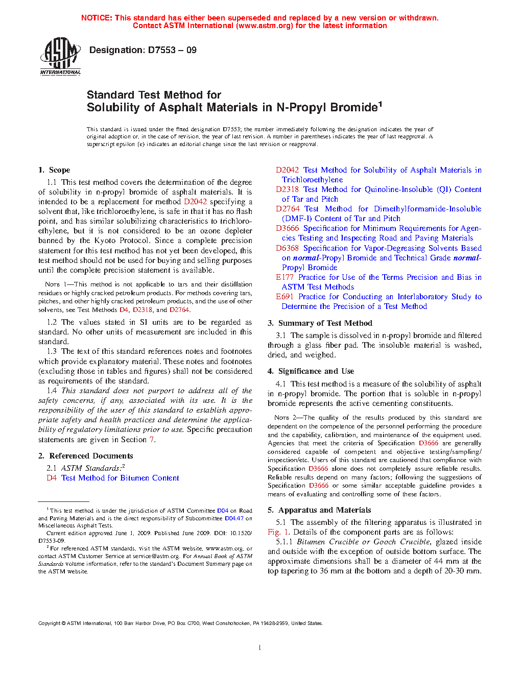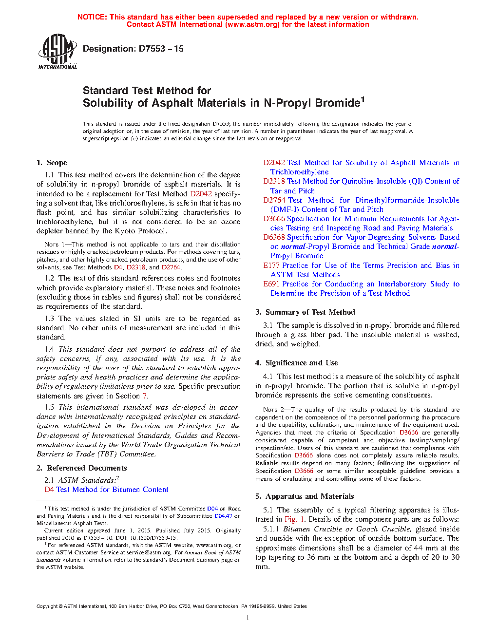1.1 This test method covers the determination of the degree of solubility in n-propyl bromide of asphalt materials. It is intended to be a replacement for Test Method D2042 specifying a solvent that, like trichloroethylene, is safe in that it has no flash point, and has similar solubilizing characteristics to trichloroethylene, but it is not considered to be an ozone depleter banned by the Kyoto Protocol.