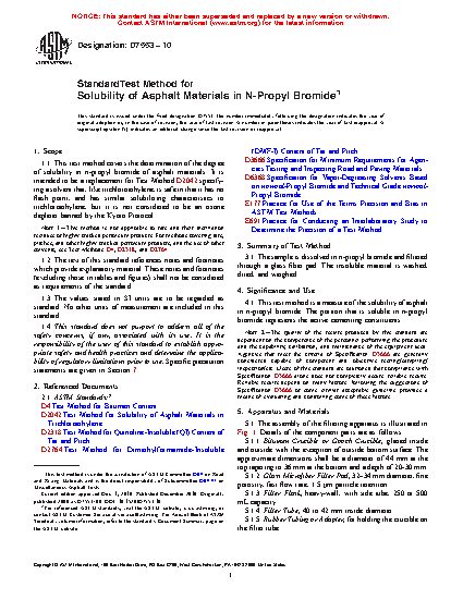 4.1 This test method is a measure of the solubility of asphalt in n-propyl bromide. The portion that is soluble in n-propyl bromide represents the active cementing constituents.