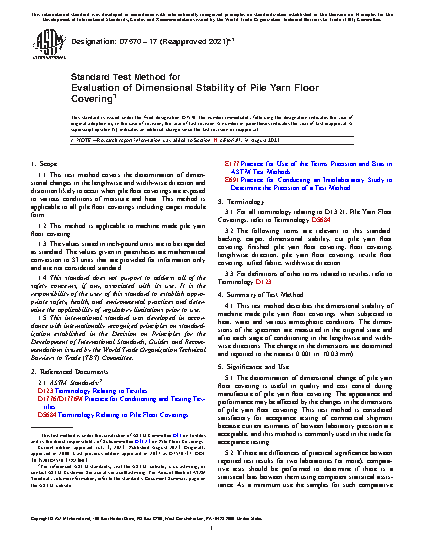 1.1 This test method covers the determination of dimensional changes in the lengthwise and widthwise direction and distortion likely to occur when pile floor coverings are exposed to various conditions of moisture and heat. This method is applicable to all pile floor coverings including carpet module form.
