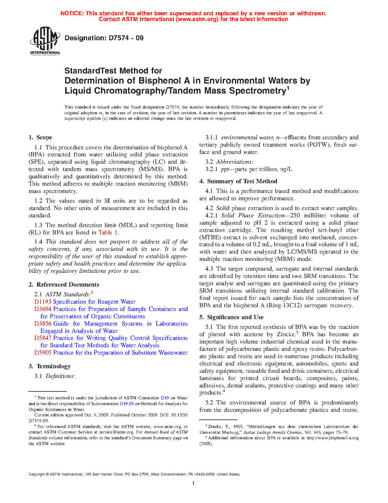 5.2 The environmental source of BPA is predominantly from the decomposition of polycarbonate plastics and resins. BPA is not classified as bio-accumulative by the U.S. Environmental Protection Agency and will biodegrade. BPA has been reported to have adverse effects in aquatic organisms and may be released into environmental waters directly at trace levels through landfill leachate and POTW effluents. This method has been investigated for use with surface water and secondary and tertiary POTW effluent samples therefore, it is applicable to these matrices only. It has not been investigated for use with salt water or solid sample matrices.
