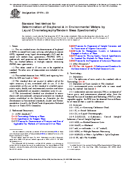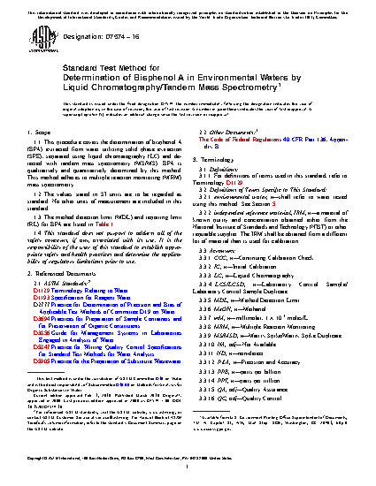 1.1 This test method covers the determination of bisphenol A (BPA) extracted from water utilizing solid phase extraction (SPE), separated using liquid chromatography (LC) and detected with tandem mass spectrometry (MS/MS). BPA is qualitatively and quantitatively determined by this method. This test method adheres to multiple reaction monitoring (MRM) mass spectrometry.