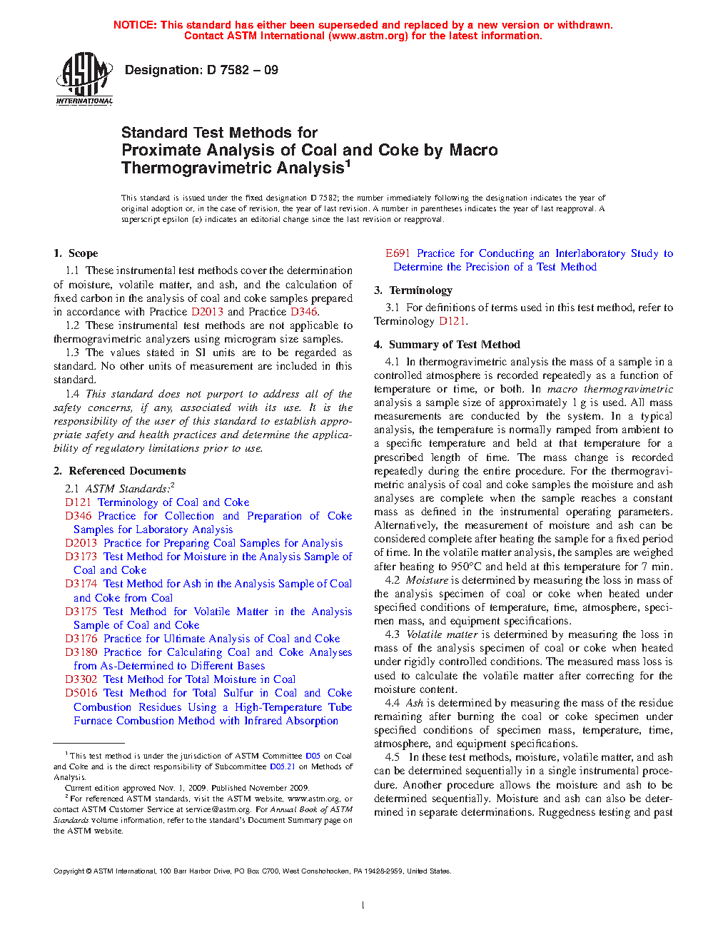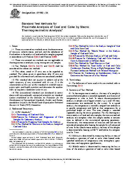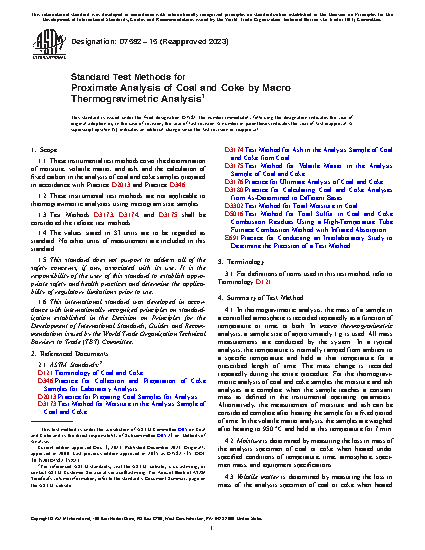 1.1 These instrumental test methods cover the determination of moisture, volatile matter, and ash, and the calculation of fixed carbon in the analysis of coal and coke samples prepared in accordance with Practice D2013 and Practice D346.