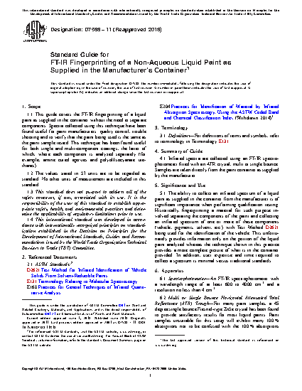 1.1 This guide covers the FT-IR fingerprinting of a liquid paint as supplied in the container without the need to separate components. Spectra collected using this technique have been found useful for paint manufacturers' quality control, trouble shooting and to verify that the paint being used is the same as the paint sample tested. This technique has been found useful for both single and multi-component coatings, the latter of which, where each component is analyzed separately (for example, amine cured epoxies and polyol/isocyanate urethanes).
