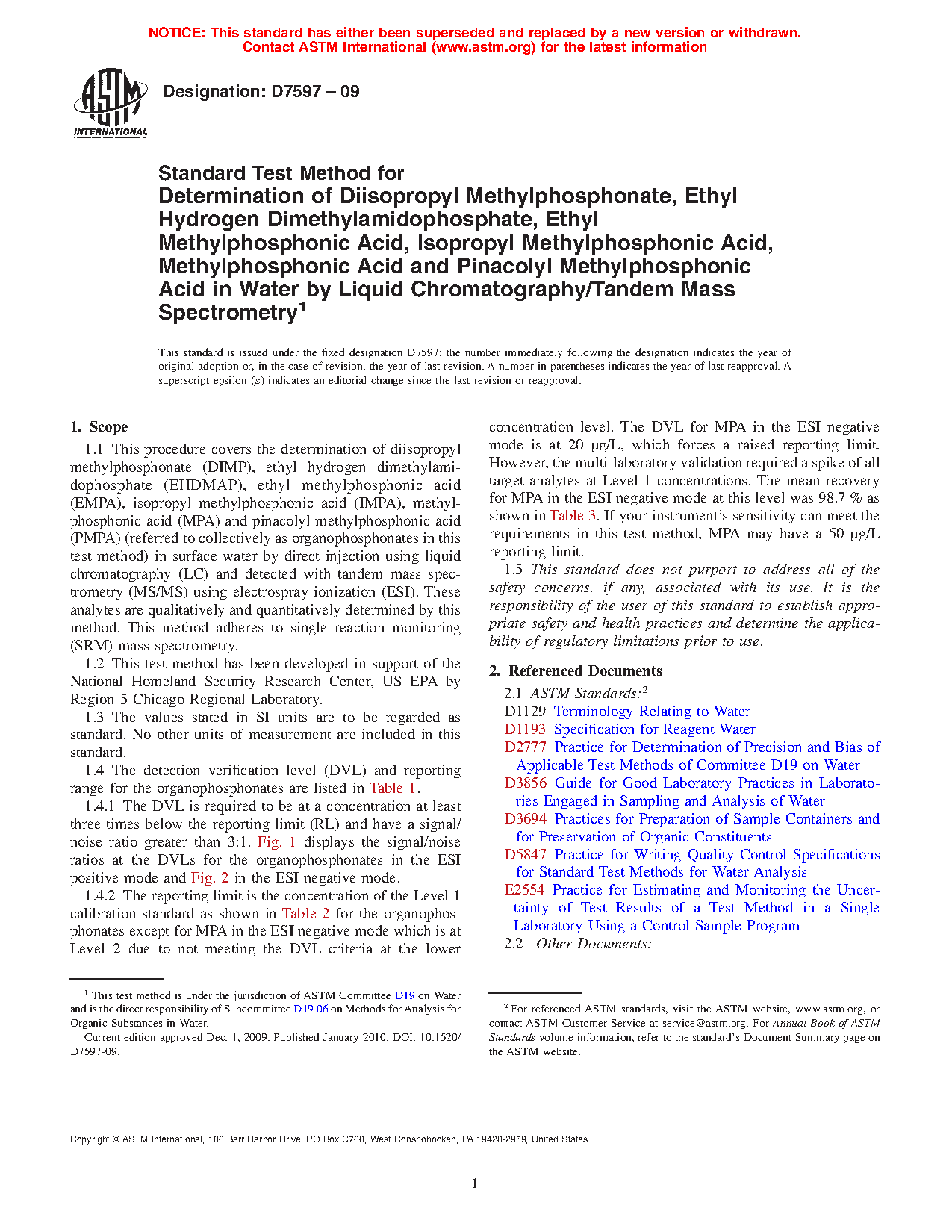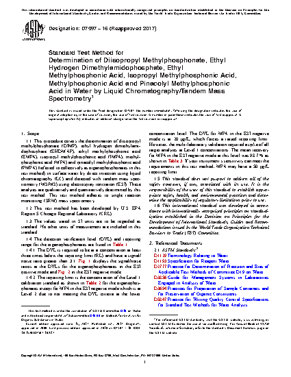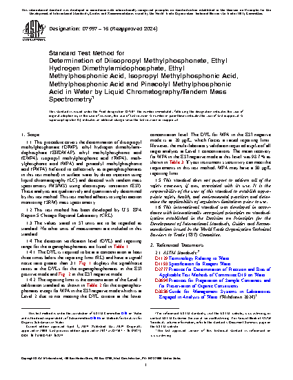 1.1 This procedure covers the determination of diisopropyl methylphosphonate (DIMP), ethyl hydrogen dimethylamidophosphate (EHDMAP), ethyl methylphosphonic acid (EMPA), isopropyl methylphosphonic acid (IMPA), methylphosphonic acid (MPA) and pinacolyl methylphosphonic acid (PMPA) (referred to collectively as organophosphonates in this test method) in surface water by direct injection using liquid chromatography (LC) and detected with tandem mass spectrometry (MS/MS) using electrospray ionization (ESI). These analytes are qualitatively and quantitatively determined by this test method. This test method adheres to single reaction monitoring (SRM) mass spectrometry.